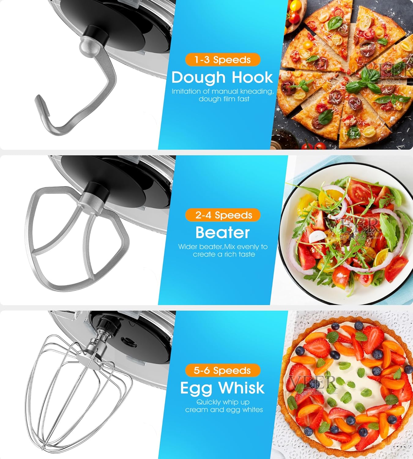 - 🍰【6 Speed Auto Control & 6.5 Stainless Steel Bowl】:Release your hands,auto and electric stand mixer with 6+P speed control to help you adjust the mix speed you need,6.5 QT food grades stainless steel bowl that can perfectly meet all your kitchen needs for a family of 3-6 person Which easily to make cakes, breads, cookies, mashed potatoes, salads,match more than 200 recipe menus for you(Tips: know more about mixing ratio of ingredients tips please contact us first )