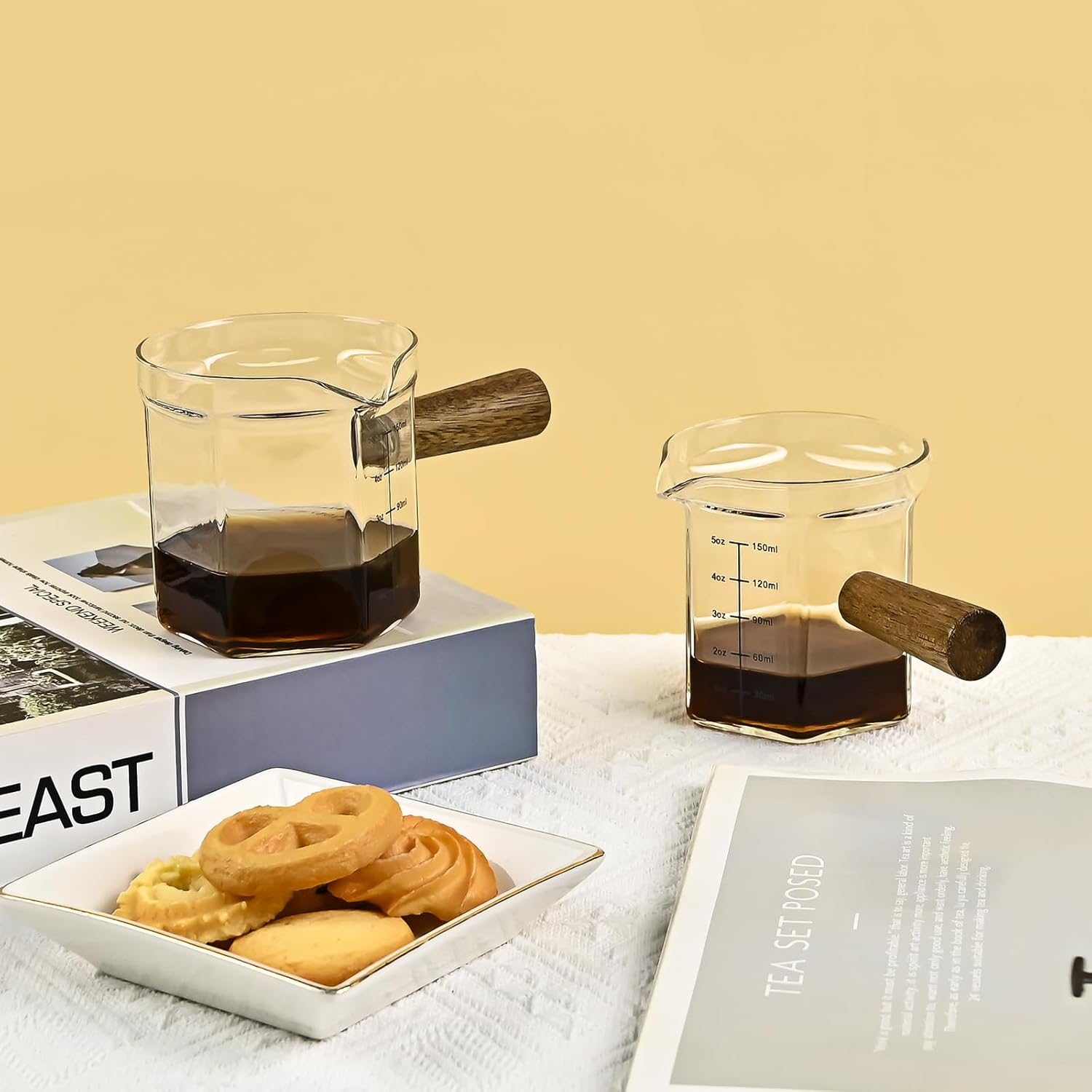 - Attractive Design: The espresso cup has a simple and exquisite appearance; with double spouts for easy pouring; a clear scale on the body of the cup to keep track of the amount of coffee you need; a wooden handle for a more comfortable grip