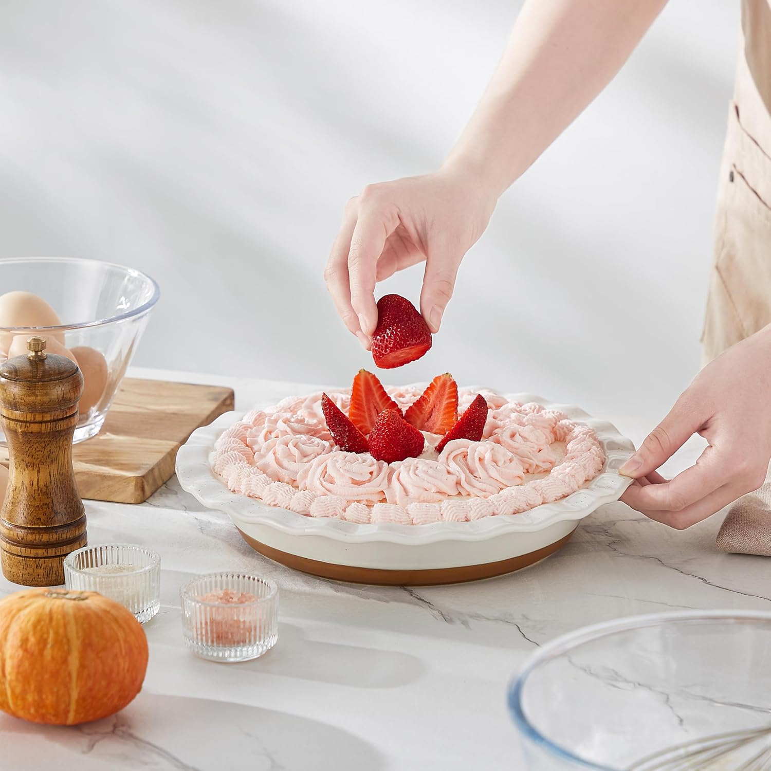- 【High-Quality Stoneware Construction】Made from durable, high-quality stoneware, this deep dish pie pan is built to last. It withstands high temperatures and maintains even heat distribution, ensuring perfectly baked crusts and fillings.
