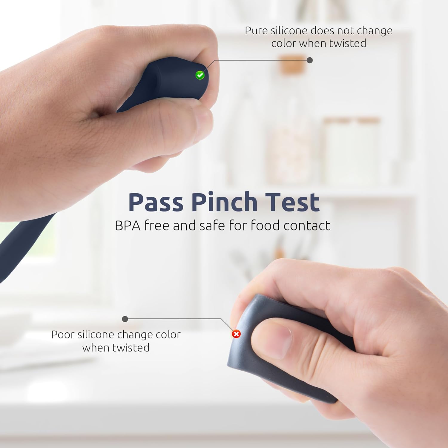 - [600℉ High Heat Resistant] U-Taste silicone jar spatula passes the pinch test, ensuring it’s completely safe for food contact. It's high heat resistant up to 600℉, making it work for handling high-heat tasks such as stirring sauces or cooking peanut brittle. This feature ensures the silicone spatula will not melt with high heat cooking and baking. The long handle also keeps your hands safe from heat. You can use it daily for your non-stick cookware as it will not damage the coating of your pan.