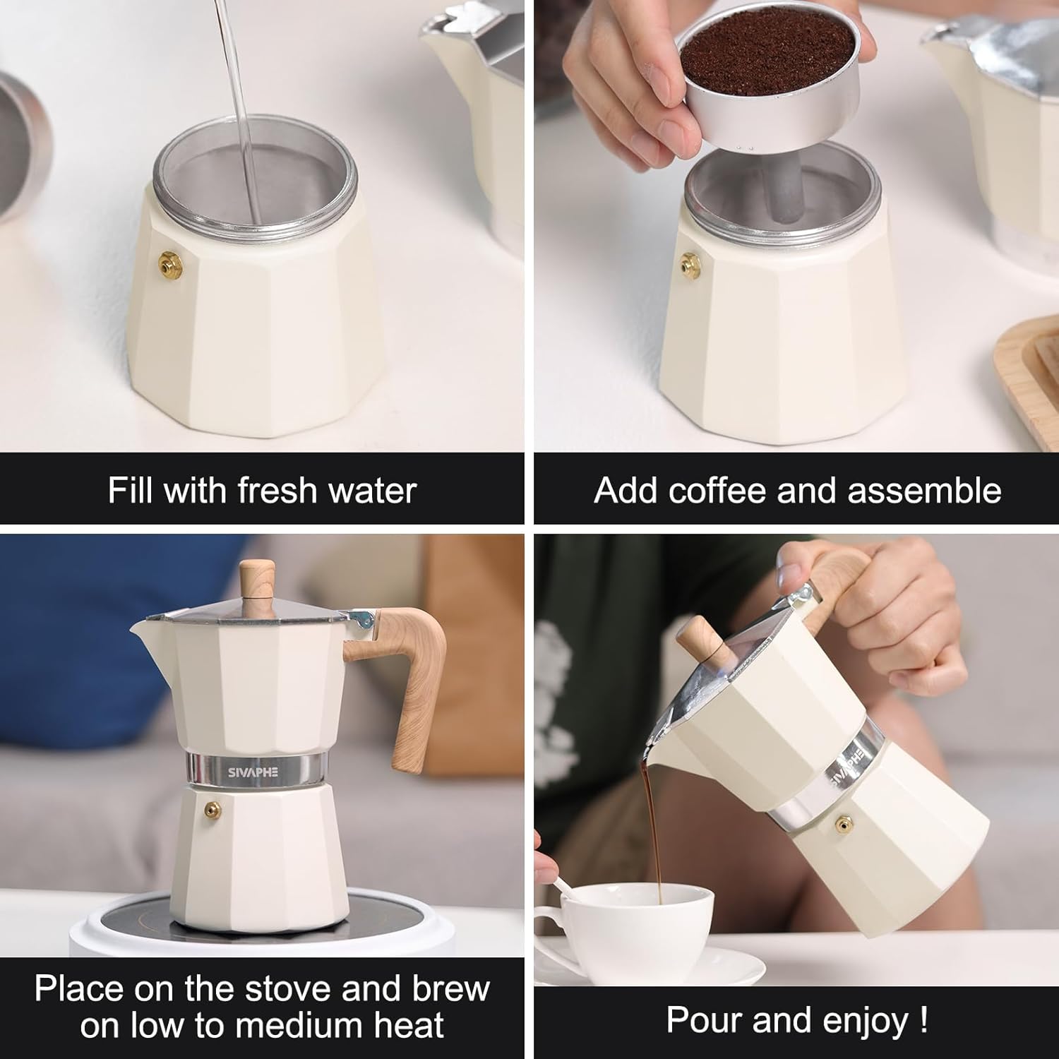 Sivaphe Aluminum Moka Pot 3 Espresso Cups, Percolator Espresso and Coffee Maker, Portable Stovetop Italian and Cuban Café Brewer for Home and Camping White