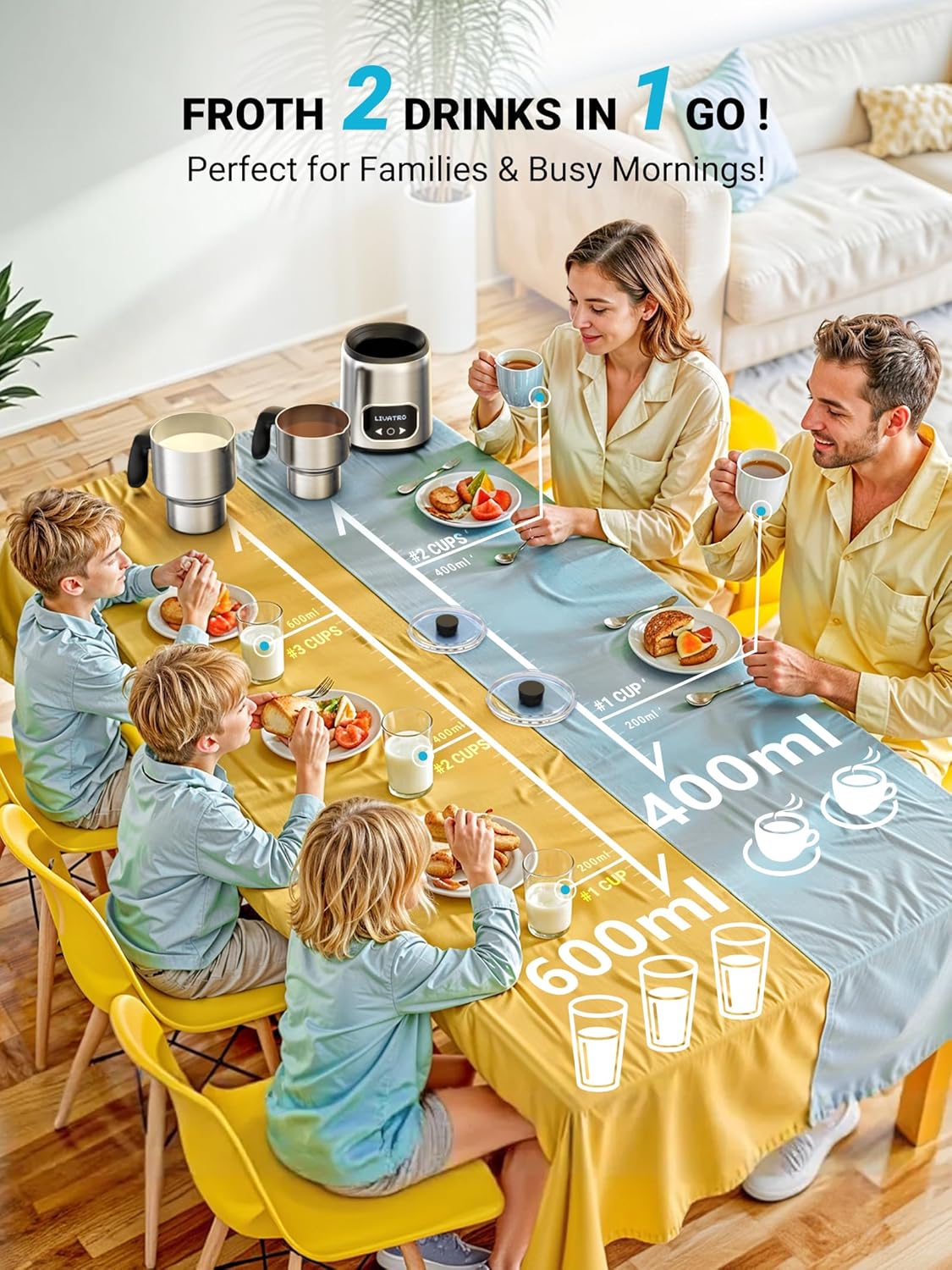 - 𝐃𝐮𝐚𝐥 𝐂𝐮𝐩𝐬 𝐟𝐨𝐫 𝐁𝐮𝐬𝐲 𝐅𝐚𝐦𝐢𝐥𝐢𝐞𝐬: The milk frother and steamer allows you to effortlessly switch between 21oz (4 servings) and 13.5oz cups, ensuring everyone's preferred foam without flavor crossover and no need for cleaning in between. Ideal for busy mornings, families, and coffee lovers.