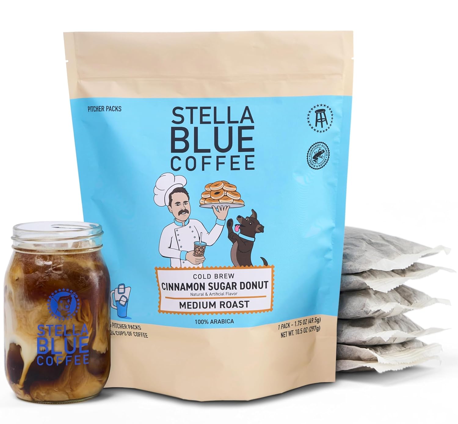 STELLA BLUE Fresh Cold Brew Coffee | Cinnamon Sugar Donut | 100% Arabica Medium Roast | Warm Cinnamon and Sweet Pastry Flavor | Cold Brew Coffee Packets | Makes 24 Pods | 6 Easy-Brew Pouches