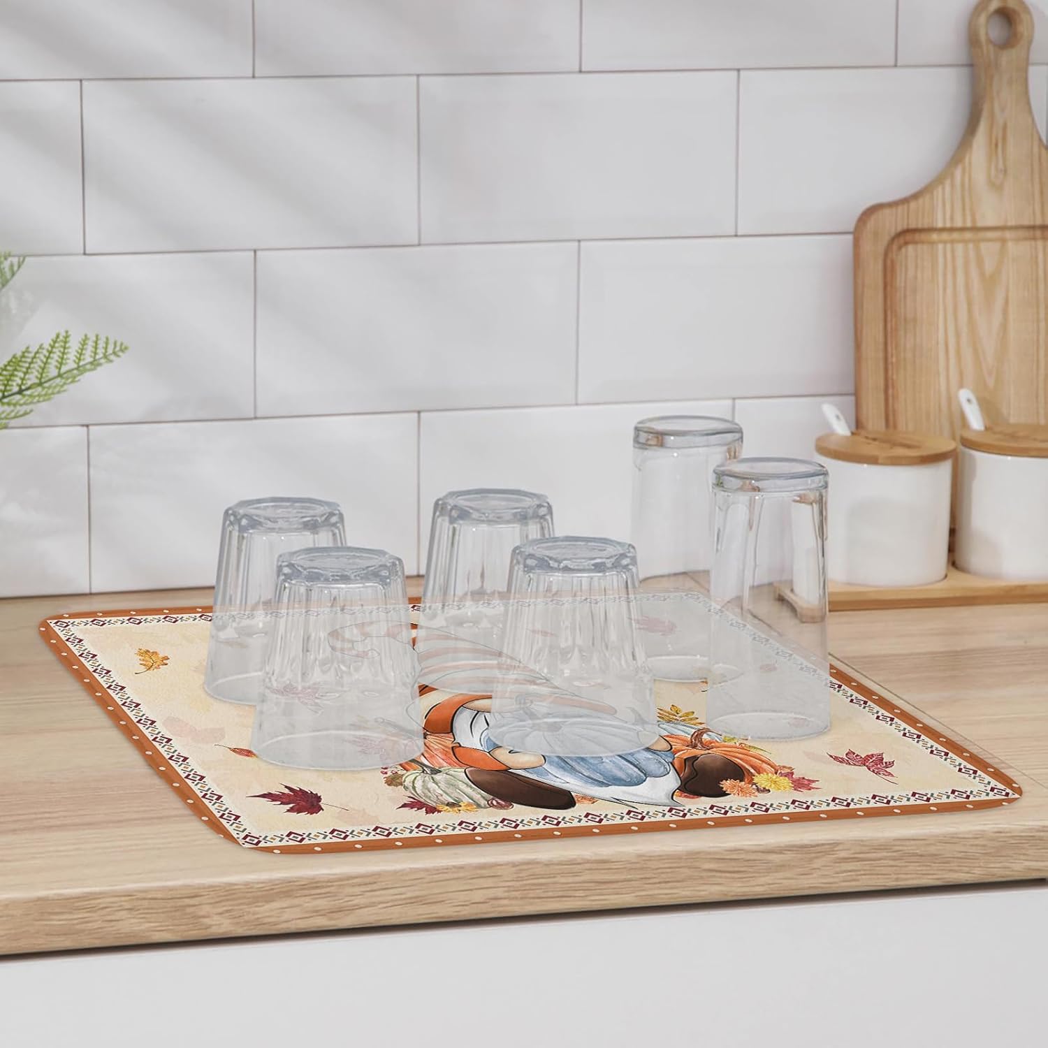 Fall Dish Drying Mat for Kitchen Counter Pumpkin Gnome Drying Pad Absorbent Drying Mats for Countertops Sinks Draining Racks Autumn Maple Leaves Drainer Holiday Harvest Thanksgiving Decorations 16x18