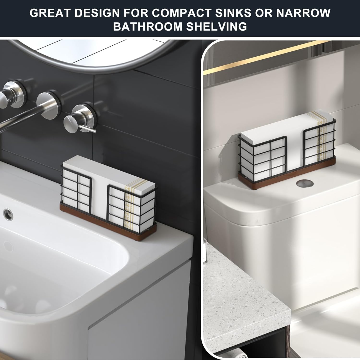 Wican Vertical Stance Bathroom Napkin Holder Takes Up Less Space for Small Guest Bathroom Oak and Iron Towel Tray for Powder Room Wooden Basket for Disposable Paper Hand Towels Black and Walnut
