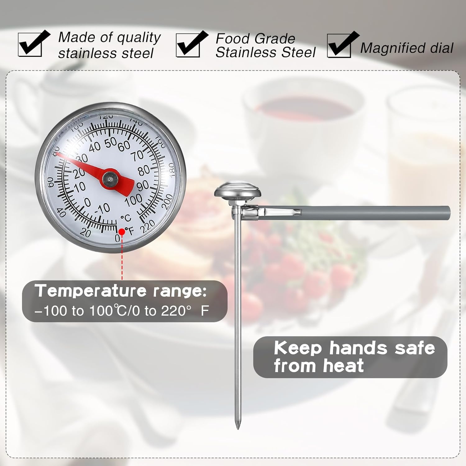 - Produce Size Information: our dial of food thermometer for cooking is approximately 1 inch/ 2.5 cm in diameter, and this long stem is around 5 inches/ 12.5 cm in length; It is compact and suitable, you can use this water thermometer to measure a lot of liquid, which is convenient and pleasant and will provide you a cozy sensation