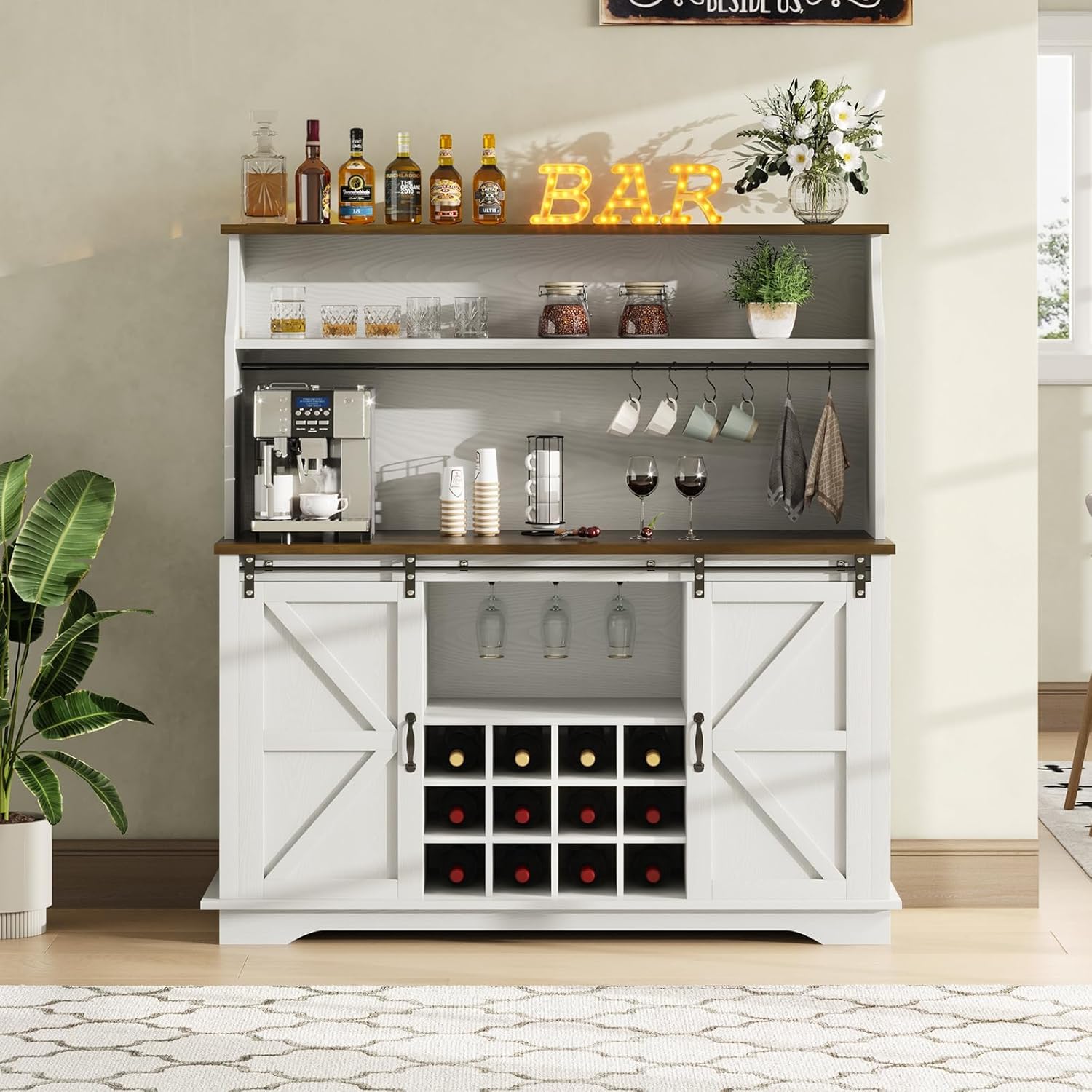 - [Classic Farmhouse Style Coffee Bar] The coffee bar features curved lines top & sliding barn door design, ideal for country/industrial style homes. It's both practical and beautiful, serving as both kitchen cabinet and living room centerpiece