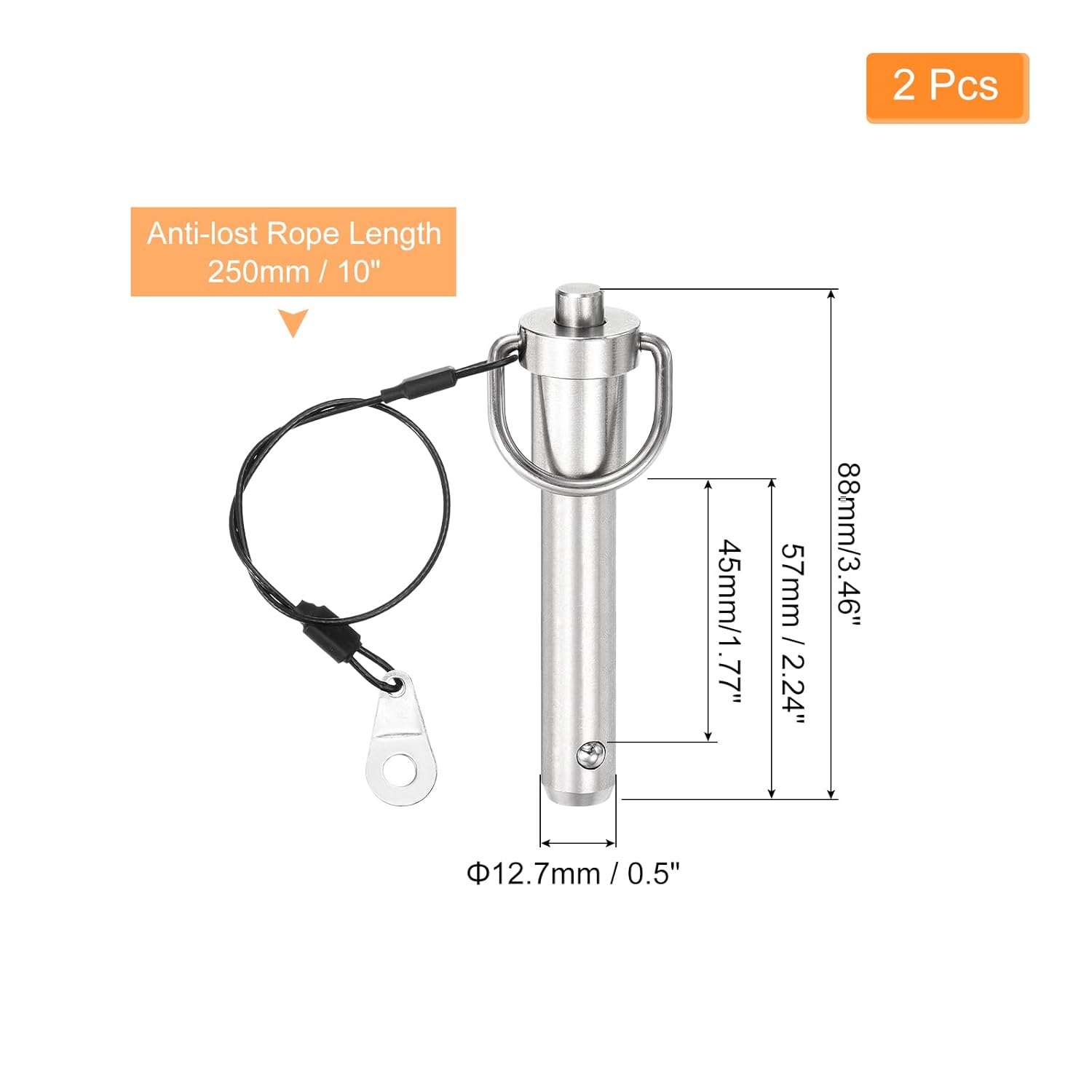 - [Quick Release Pin] The size of the quick-release pin rod is 12.7x57mm/0.5x2.24inch (Dia*L), the usage length is 45mm/1.77inch, the length of the anti-lost rope is 250mm/10inch, the total length is 88mm/3.46inch, and the package includes 2 pcs quick-release pin, please select the correct size quick release pin.