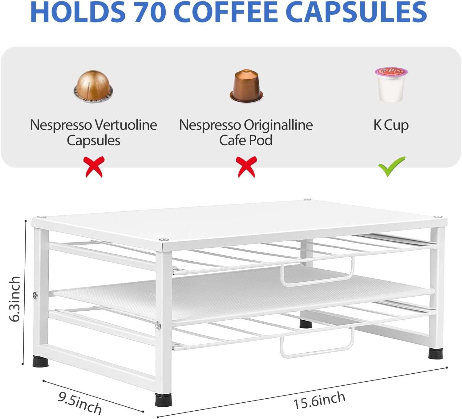 K Cup Holder Organizer for 70 Pods, 2-Tier Coffee Pod Holder for K-Cup with 2 Sliding Storage Drawers, Coffee Station Bar Organizer Accessories for Kitchen Countertop Home Office, White