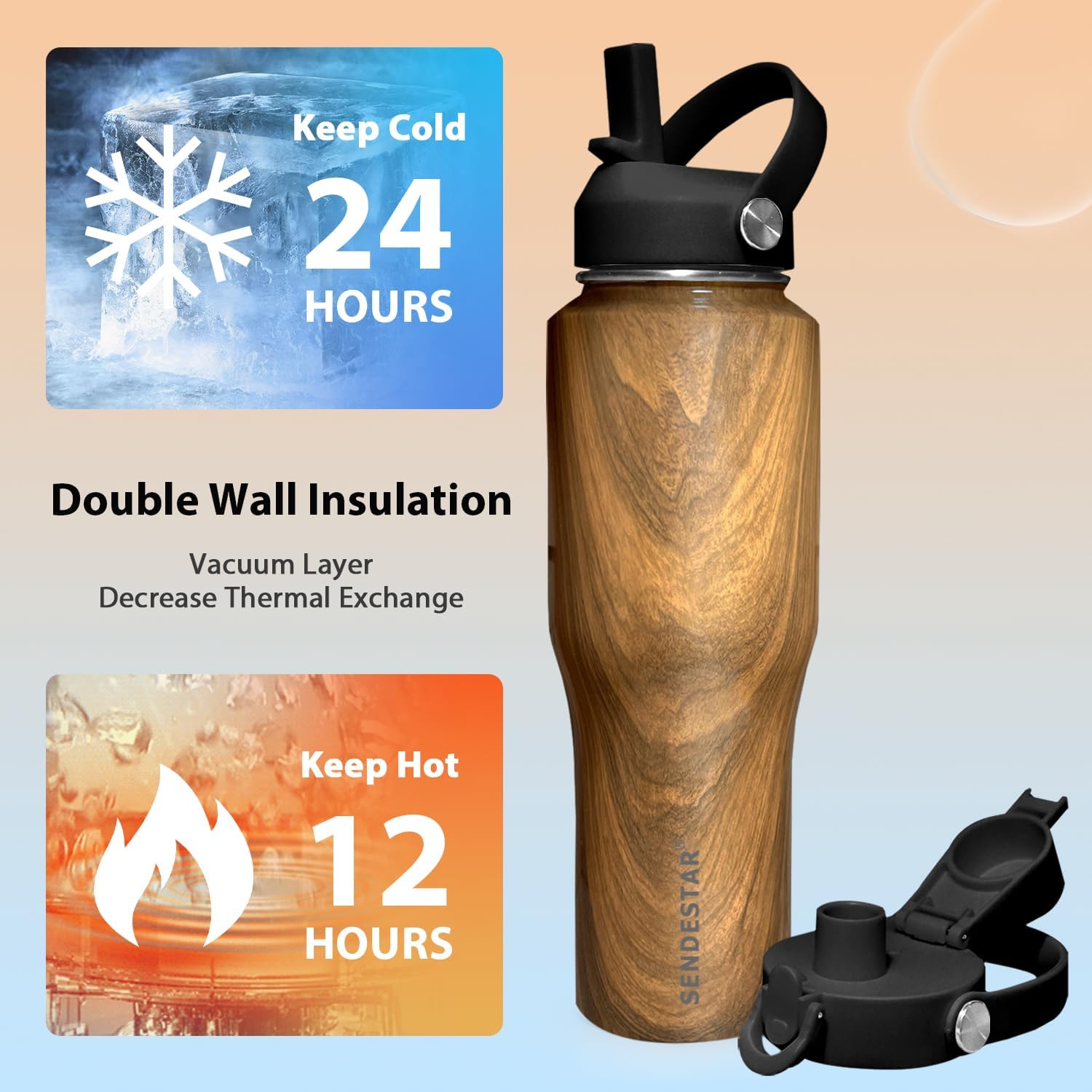SENDESTAR 40oz Stainless Steel Water Bottle(Cold for 48 Hrs, Hot for 24 Hrs),Double Wall Vacuum Insulated Bottle with Straw Lid, Spout Lid and Flex Cap, Fit in Any Car Cup Holder TXIN-40-Wood
