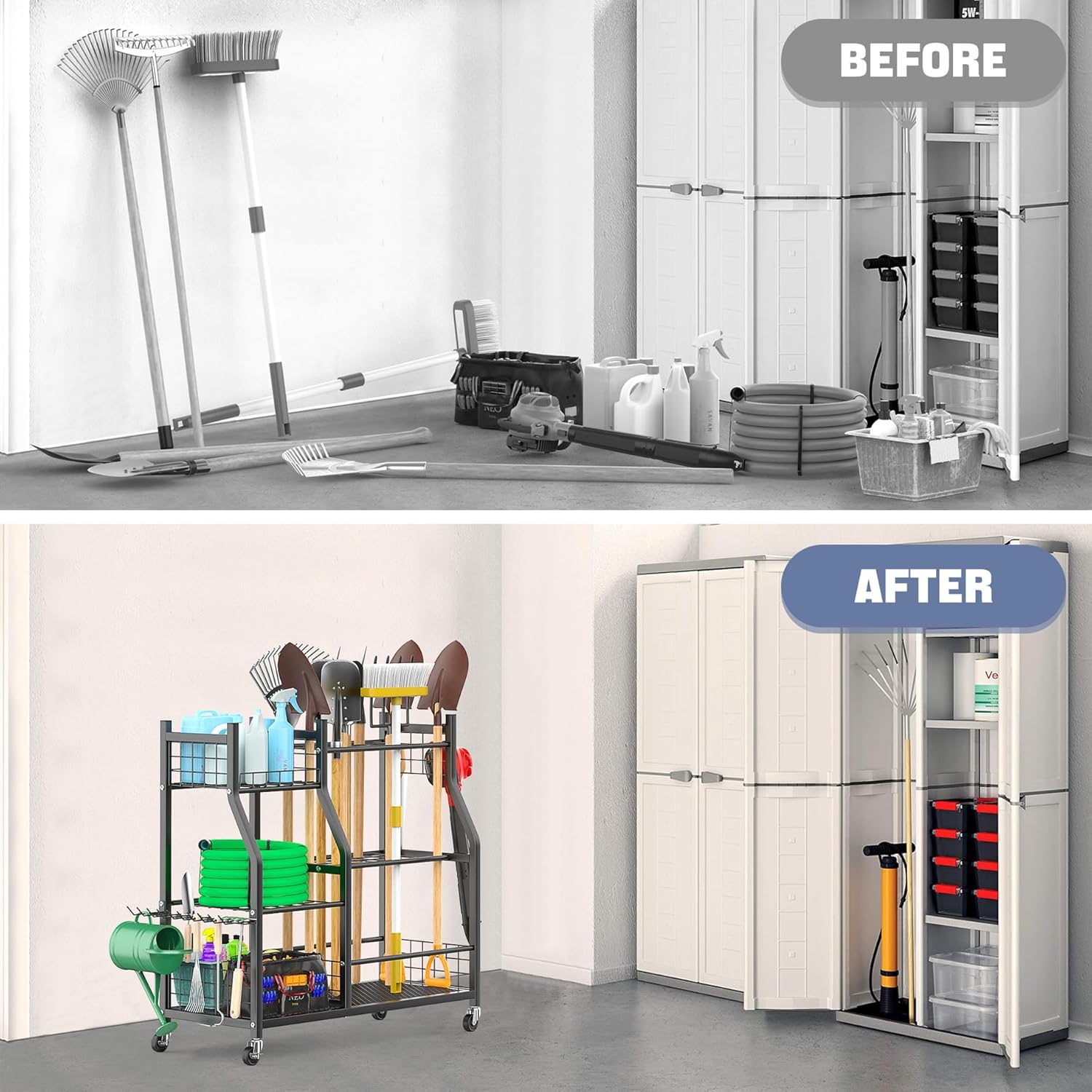 WALMANN Garden Tool Organizer with Wheels for Garage, Large Storage Capacity, Rakes/Shovels/Yard Tools Storage Stand for Shed, Garden, Indoor/Outdoor Long-Handled Tools Rolling Cart