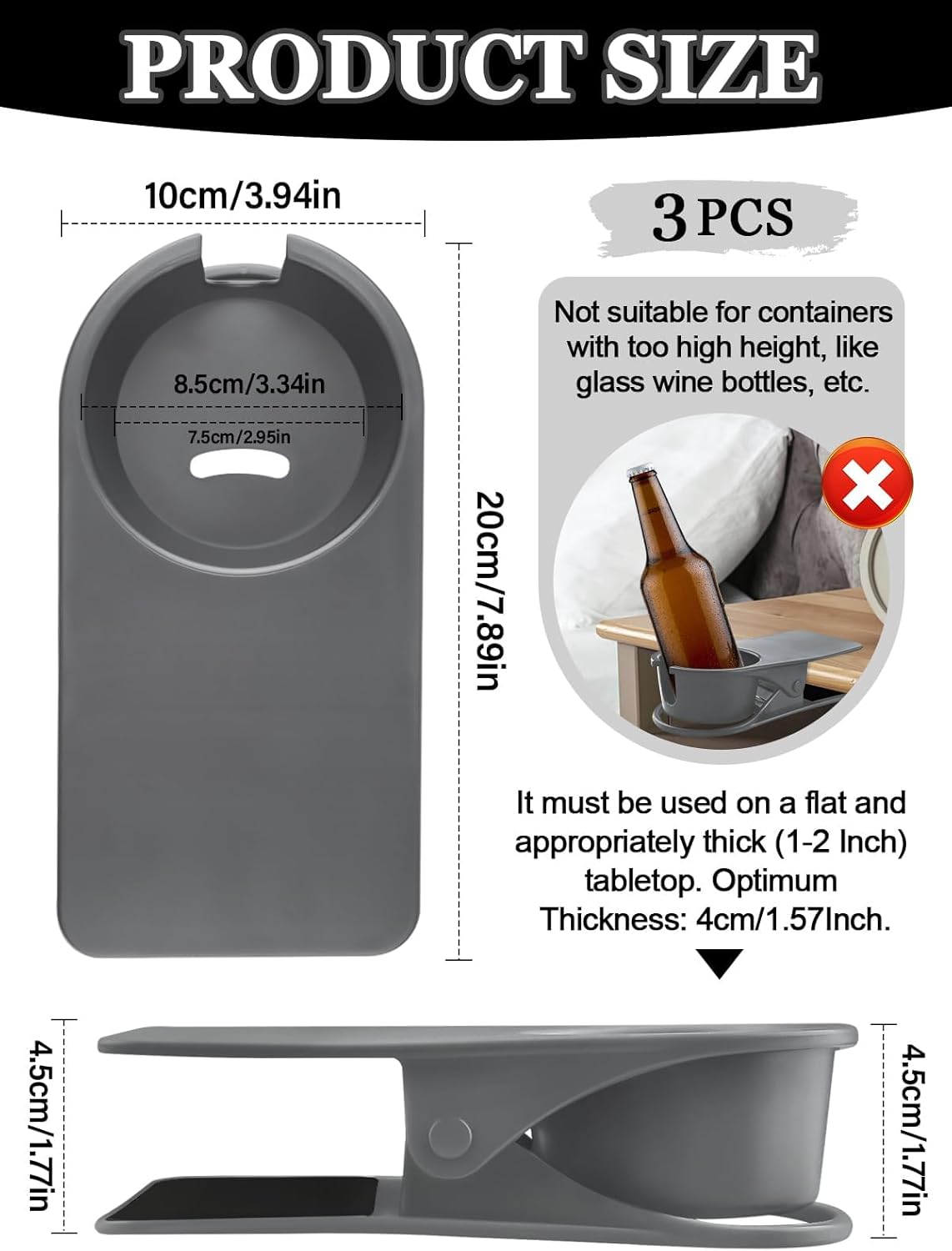 - ⚪ Keep Your Desktop Tidy: This cup holder clamp has an opening of 3.3 inches and can bear 1 kg. It can be clamped on tables with 1"~2.5" thickness, and is more suitable for thicker surfaces above 4cm/1.57". It is ideal for placing drinks, mobile phones, plants, etc. In addition, it can also be used in classrooms, game rooms, hospitals, and on buses and trains. It is your right-hand helper to keep your desktop tidy!