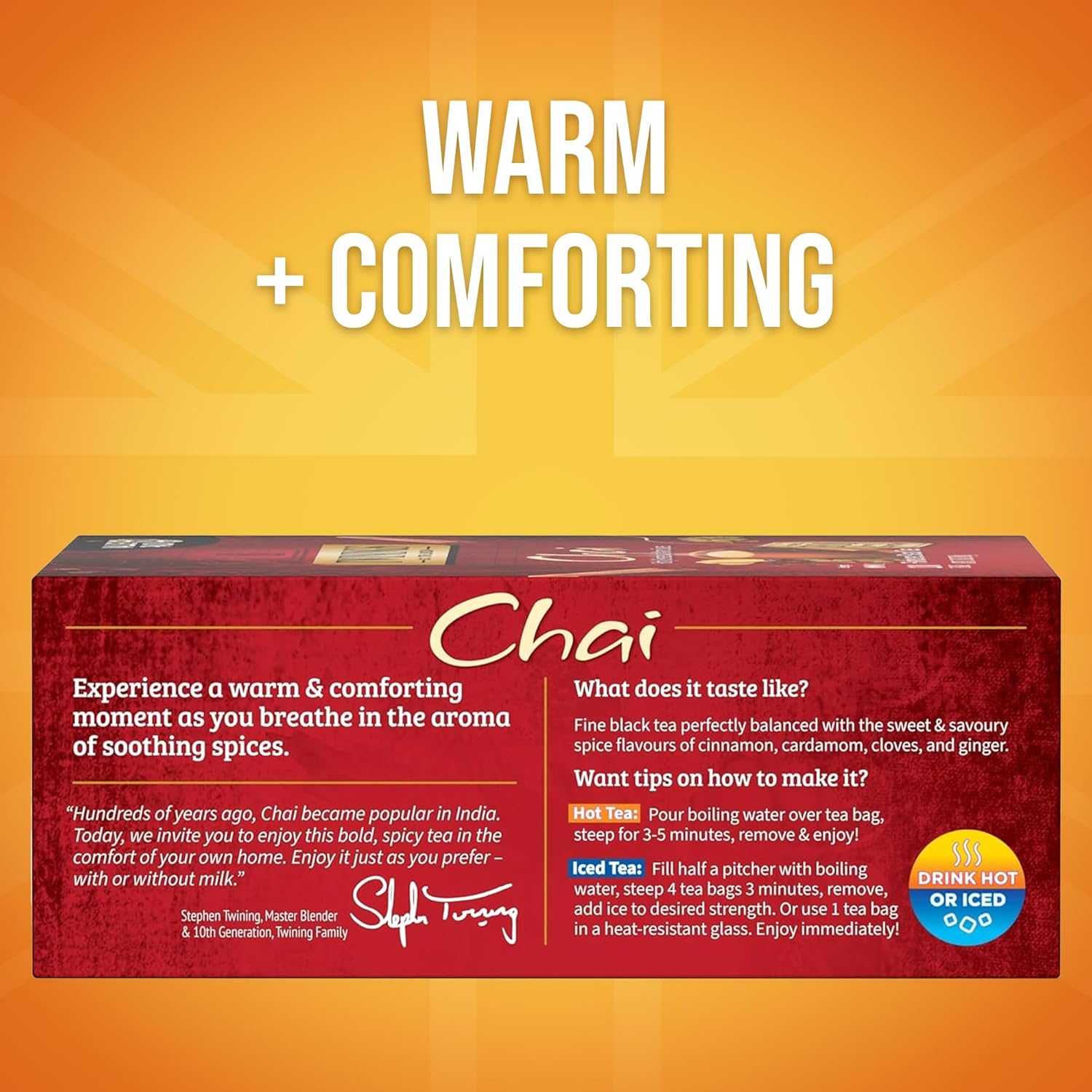 - DRINK IN LIFE: a box of 100 Chai Flavoured Black Tea, by Twinings. Experience a warm & comforting moment as you breathe in the aroma of soothing spices.
