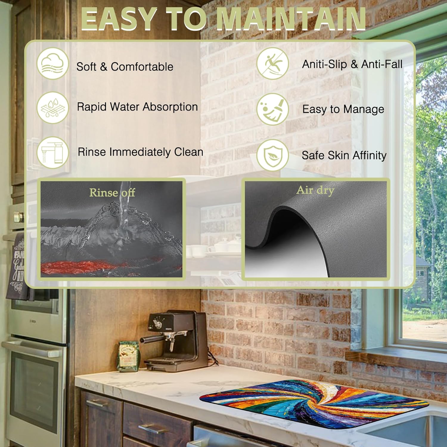 - Material and sizes:This kitchen mat is made of absorbent suede,diatom mud and non-slip rubber,two sizes:12" X 19" and 16" X 24" it fits most counters