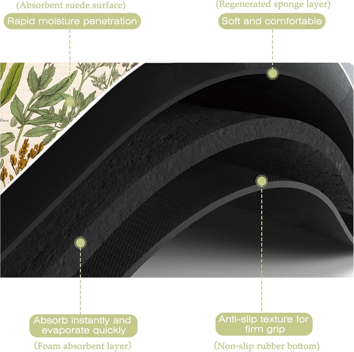 - Super absorbent and non-slip:This kitchen mat absorbent layer is made of absorbent suede and diatom mud,the surface porosity of the product is as high as 85%,which can quickly absorb water and stains,the texture design on the back is more non-slip