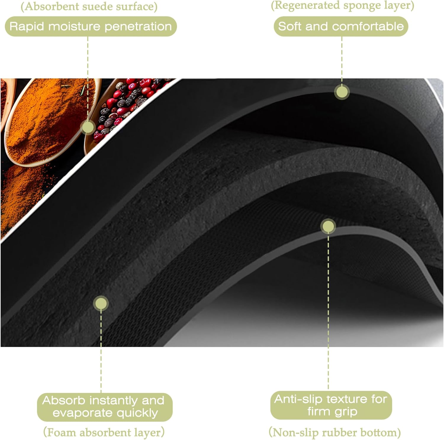- Super absorbent and non-slip:This kitchen mat absorbent layer is made of absorbent suede and diatom mud,the surface porosity of the product is as high as 85%,which can quickly absorb water and stains,the texture design on the back is more non-slip