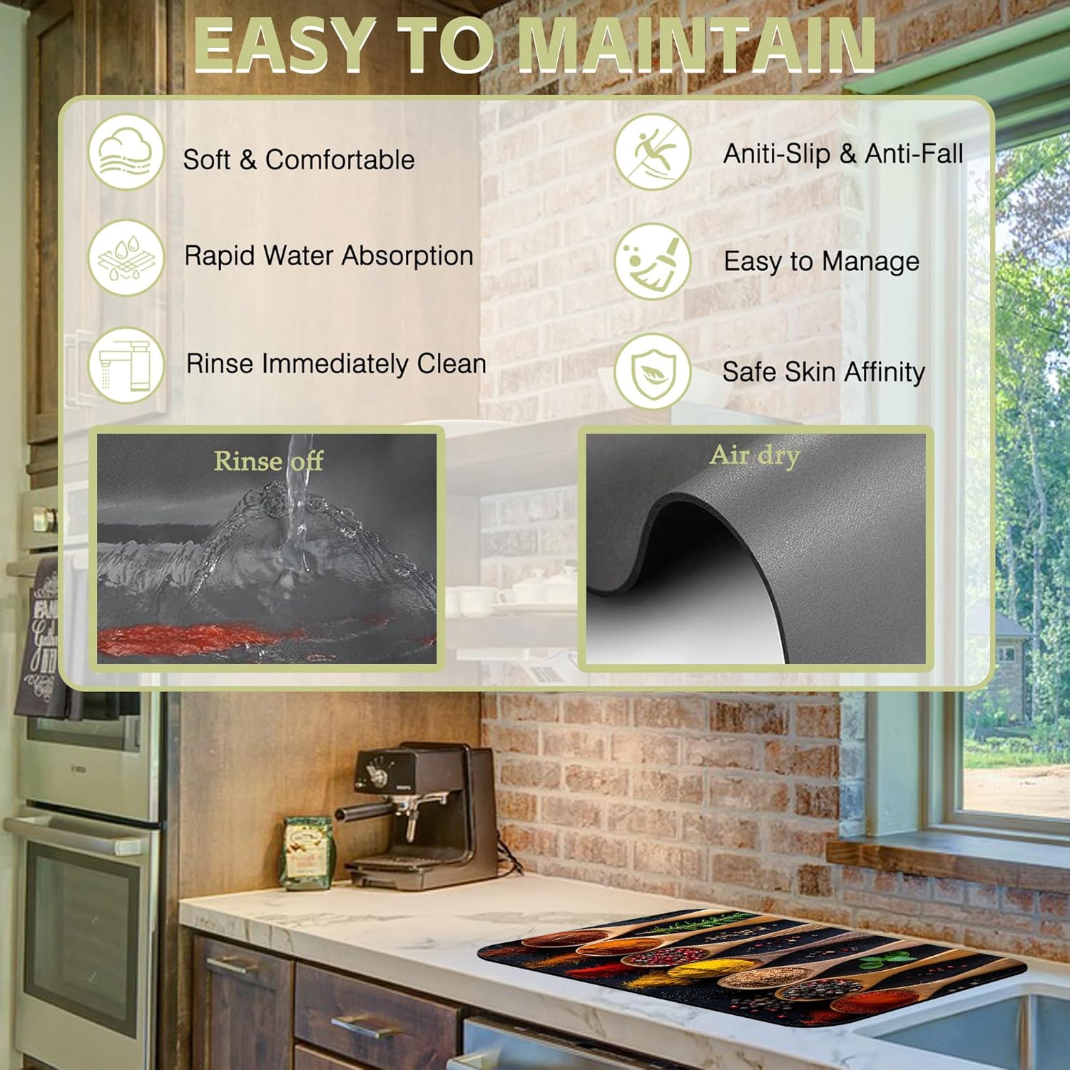 - Material and sizes:This kitchen mat is made of absorbent suede,diatom mud and non-slip rubber,two sizes:12" X 19" and 16" X 24" it fits most counters