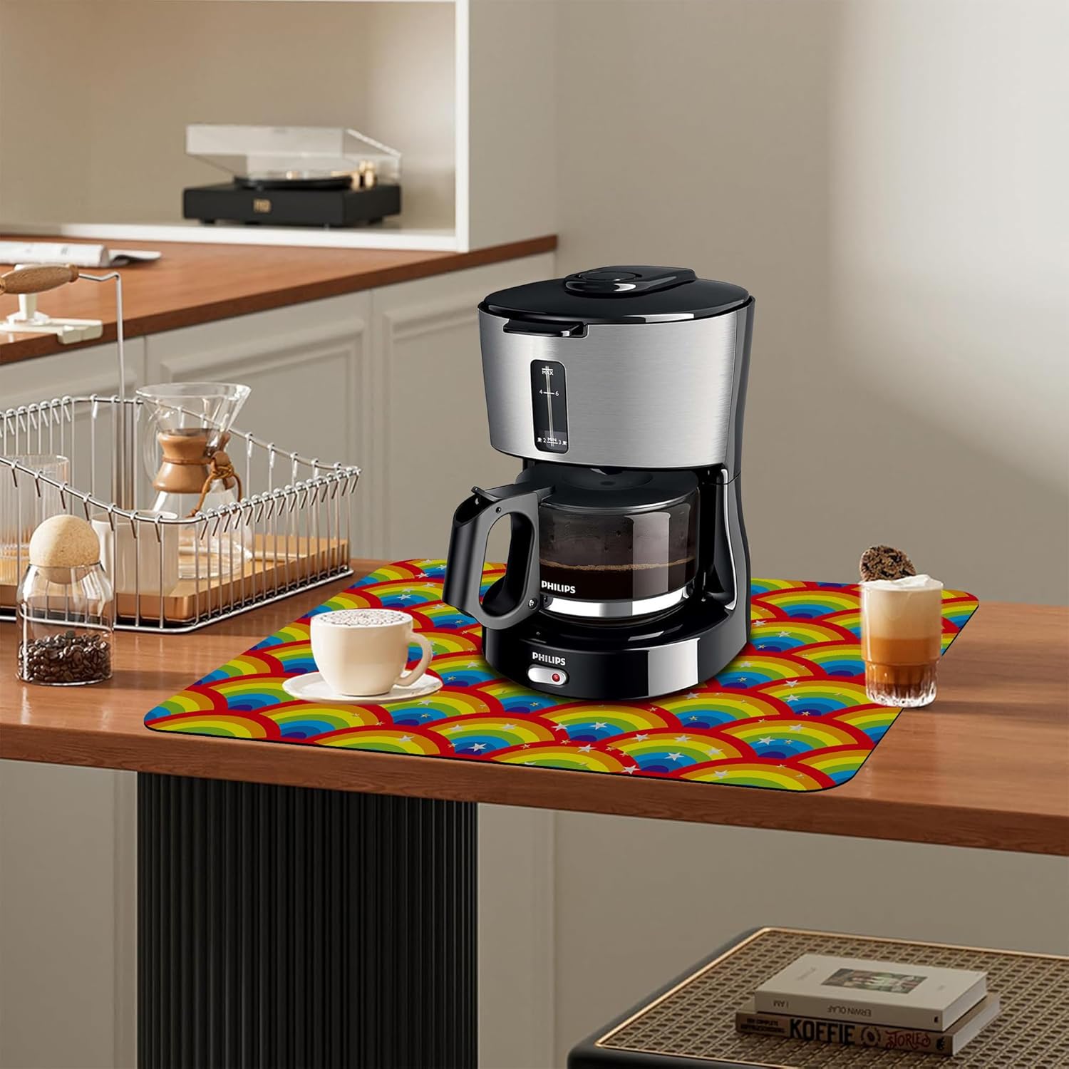 Kitchen Mat Rainbow Half Circle Star Dish Drying Mat 16"x24" Bsorbent Coffee Maker Mat for Sink Dishes or Under Rack Kitchen Counter Accessories Absorbent Hide Stain Rubber Backed Dish Drying Pad