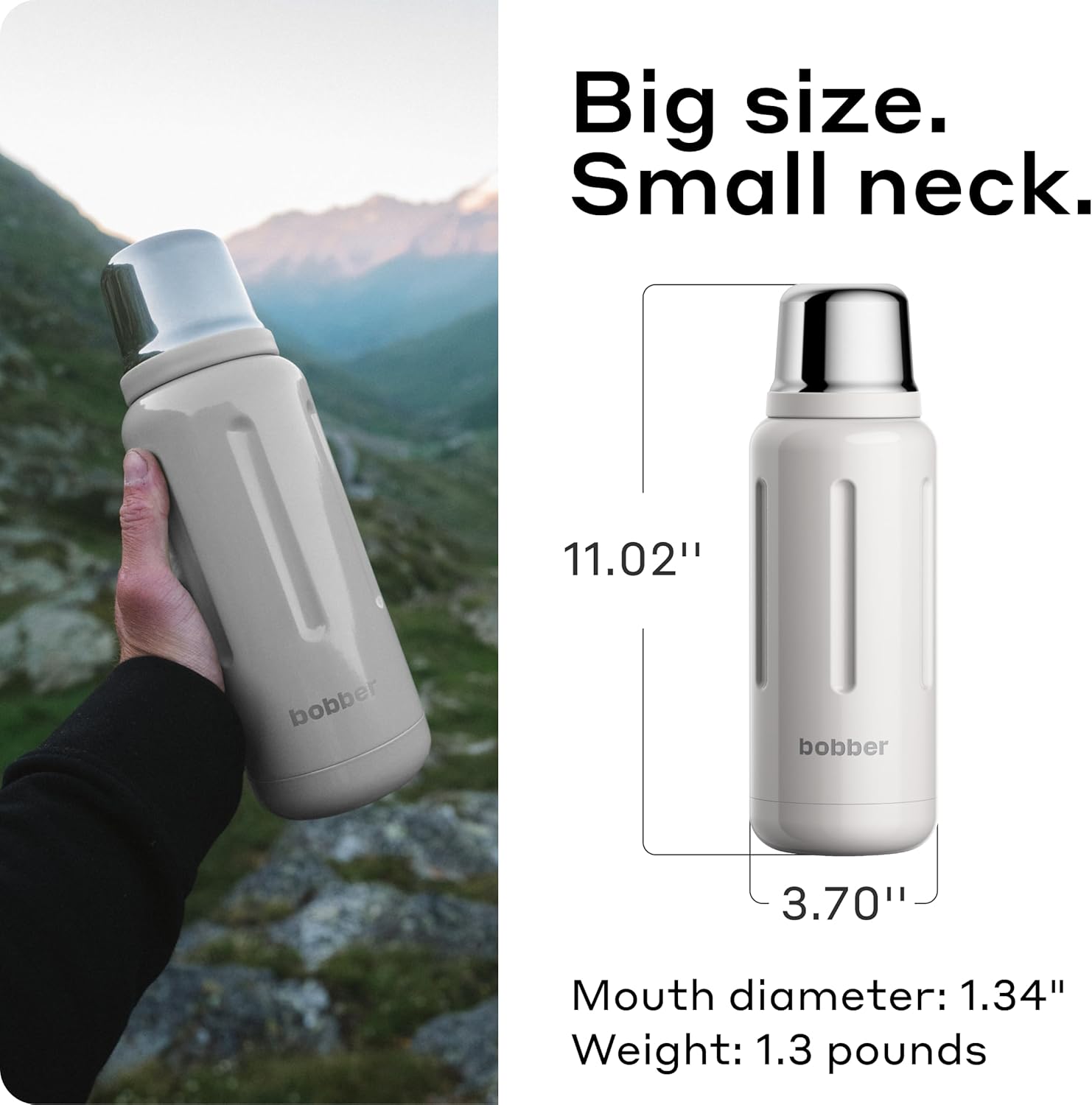 BOBBER 34 oz Stainless Steel Travel Thermos for Hot and Cold Drinks – Dishwasher Safe Metal Water Bottle with Cup Lid – Keeps Hot for 48 Hours – BPA-Free, Vacuum Insulated (Sand Grey)