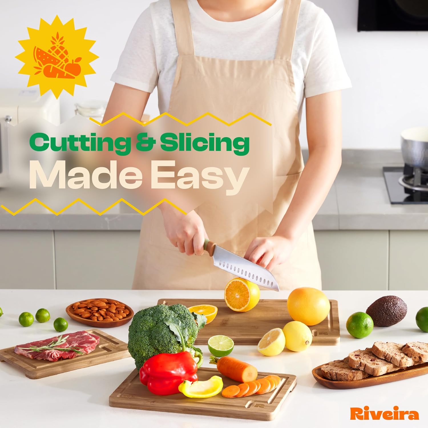 - Premium Crafted Bamboo — Take a detour from traditional kitchen aesthetics with this brown bamboo wood board crafted from 100% natural bamboo. Beyond being an unconventional and eco-friendly choice, the chopping board wood proudly showcases the environment friendly and organic bamboo. This wood cutting boards for kitchen counter adds an unexpected touch of confidence and style to your once-orderly culinary space. Riviera's wooden chopping boards for kitchen will be there for you.