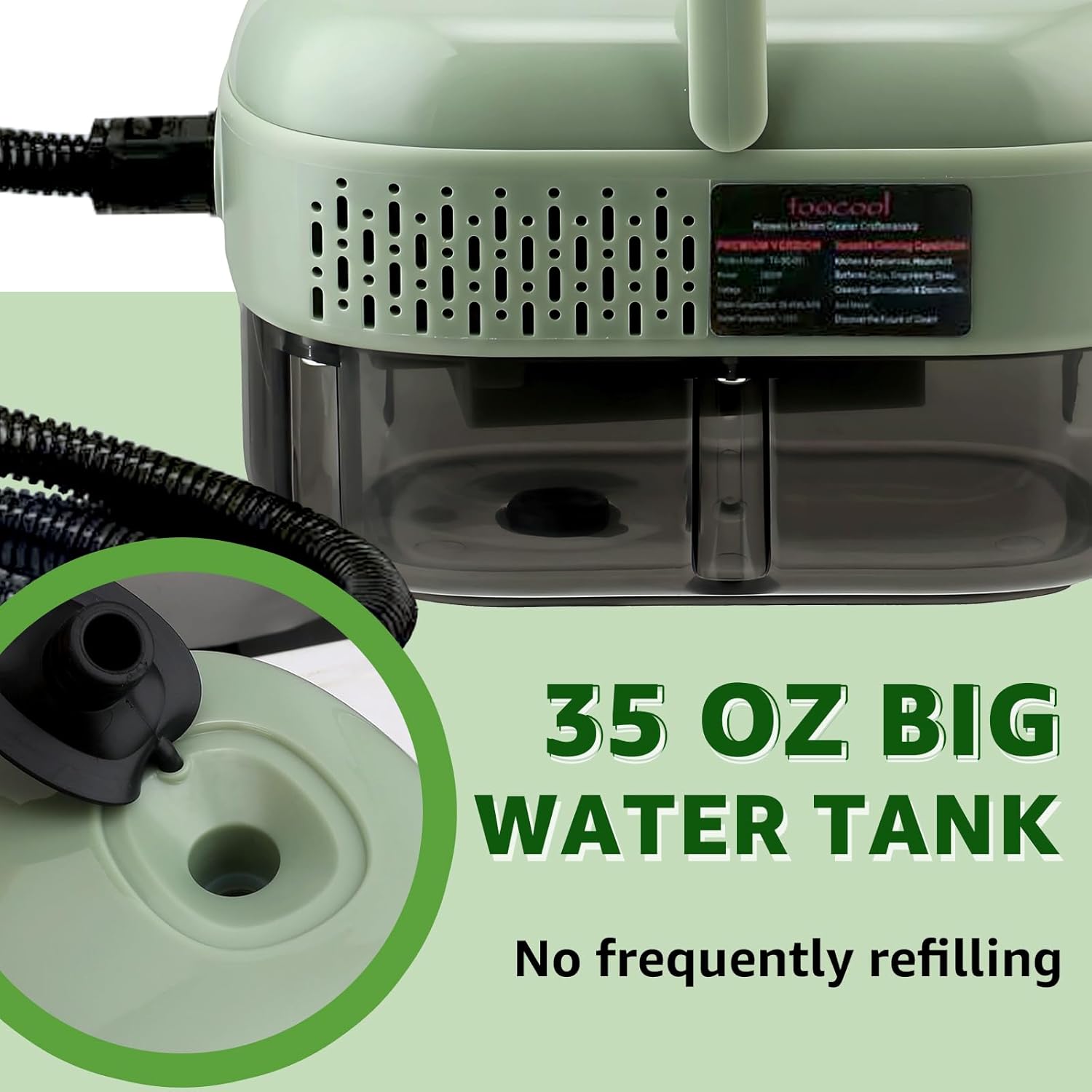 - 1100ML LARGE WATER TANK: The deep steam cleaner is equipped with a 1100ML water tank, saying goodbye to the trouble of frequent water filling, allowing you to focus on cleaning. The steam cleaner for car adopts a funnel-shaped water filling port design, which allows you to easily add water by simply lifting the top cover. The pressurized handheld steam cleaner has a convenient drainage hole at the bottom to ensure cleaning efficiency.