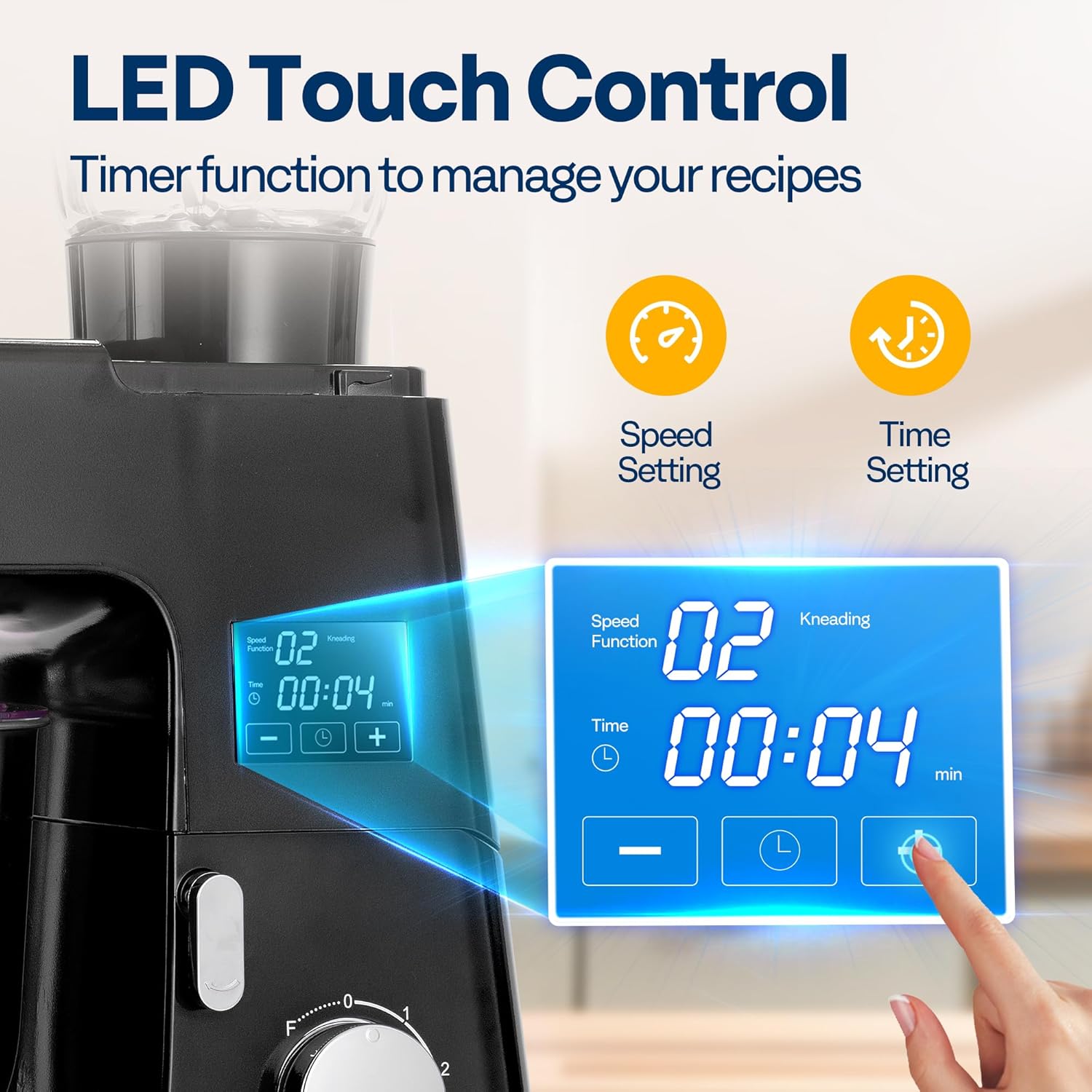 - USER-FRIENDLY DESIGN: The LED display with a built-in timer lets you control the speed and time with ease; The splash guard keeps your kitchen clean while adding ingredients; The tilt-head design allows for quick access to the bowl and attachments; The base includes suction cups to prevent movement on your countertop, ensuring stability during use; The overheat protection feature ensures safe operation, extending the mixer's lifespan