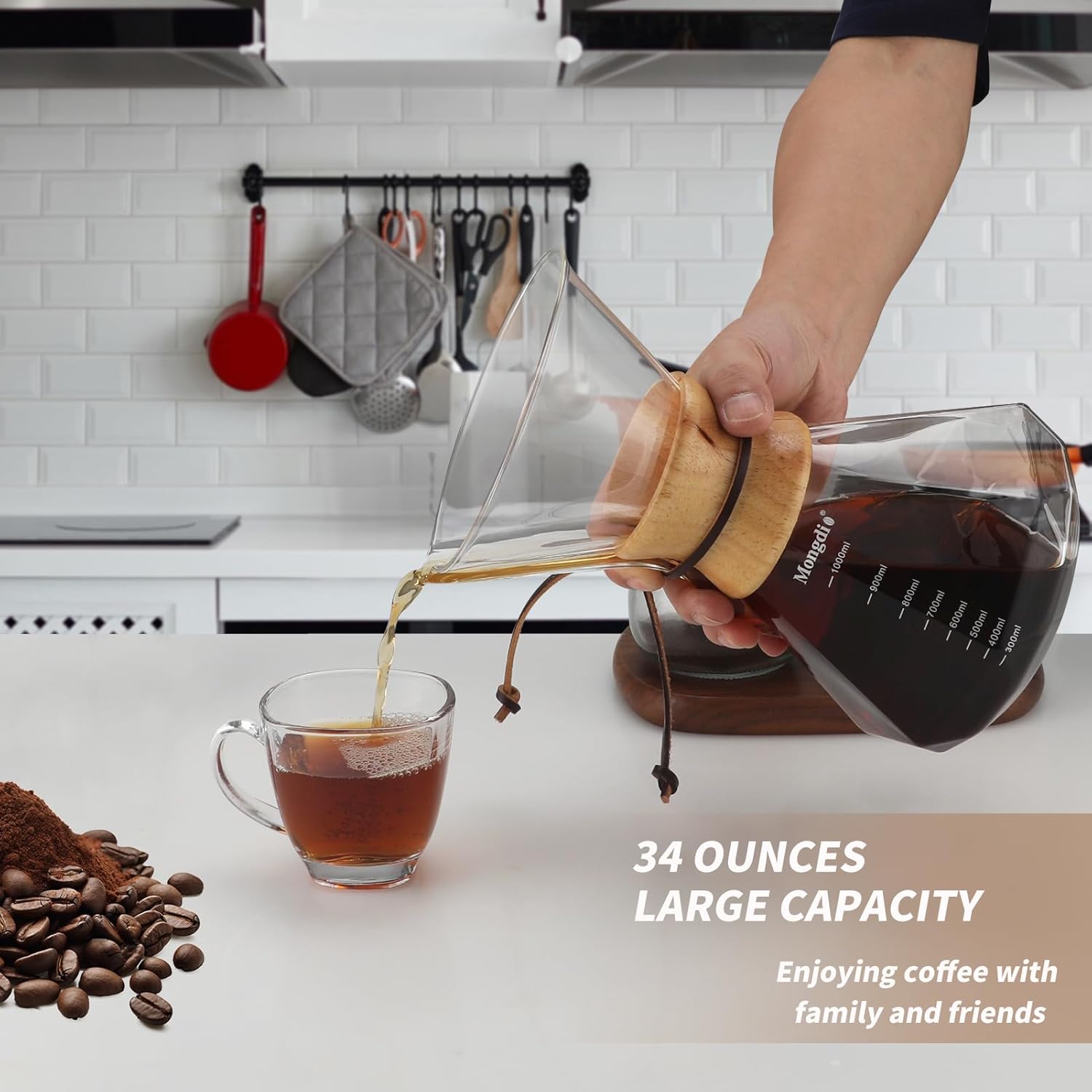 Mongdio 34oz/1000ml Pour Over Coffee Maker with Reusable Stainless Steel Filter and Wooden Collar Holder, 6-8 Cups Borosilicate Glass Coffee Maker for Camping Home, Clear