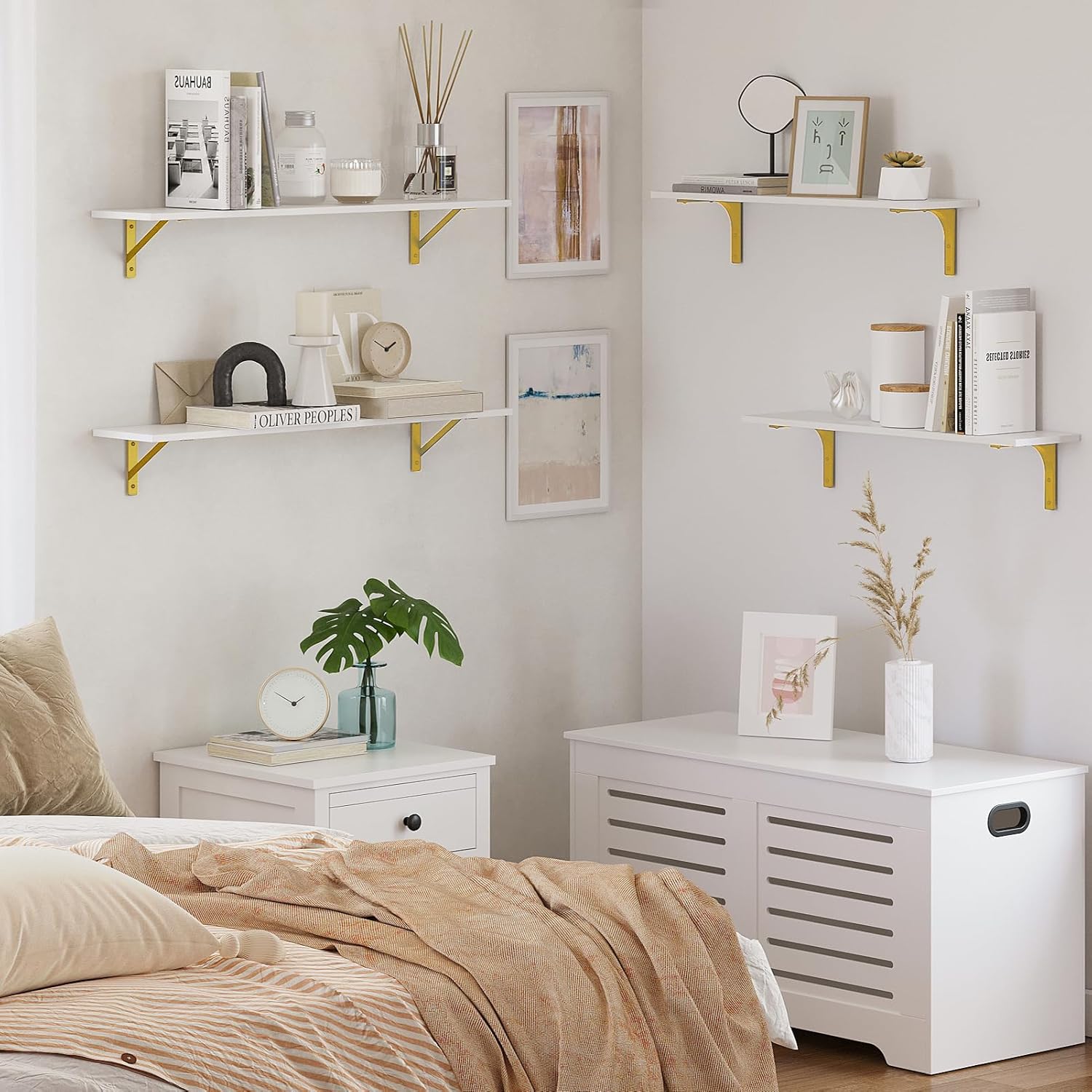 - 【Stunning Home Decor】Triangle iron brackets bring super stability and elegant simplicity, never out of date. It combines white and gold design, minimalist metal lines, making your home full of modernity and elegance. Play your creativity to build an eye-catching area by freely arranging these shelves