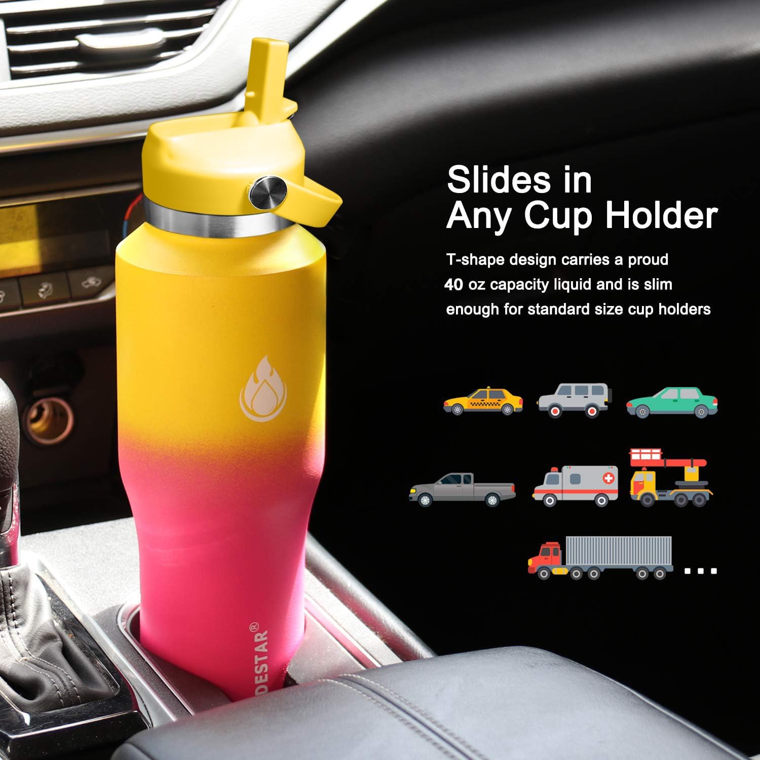 - 【FITTED DESIGNED WATER BOTTLE】 SENDESTAR T-shape water bottle with its sleek and new designed slim outline fits in any standard cup holder snugly.The largest capacity water flask can fit in any standard cupholder, perfect for outdoor activities especially for driving,field trip,beach,camping,cycling,etc