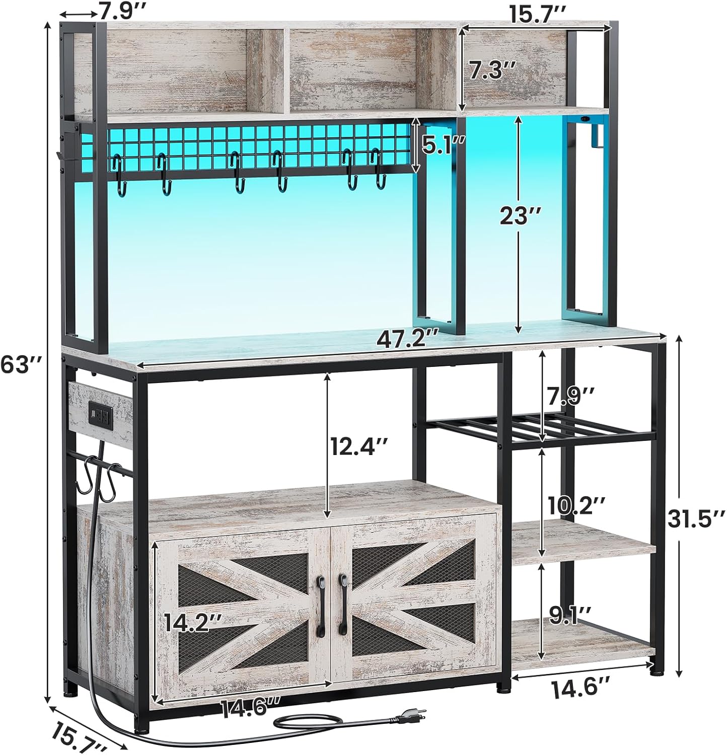 Itaar 47.2 Inch Bakers Rack with Power Outlet, Microwave Stand with Storage, Farmhouse Coffee Bar Cabinet Station with Wine Rack, Iron Grid and 8-S Hooks, Vintage White