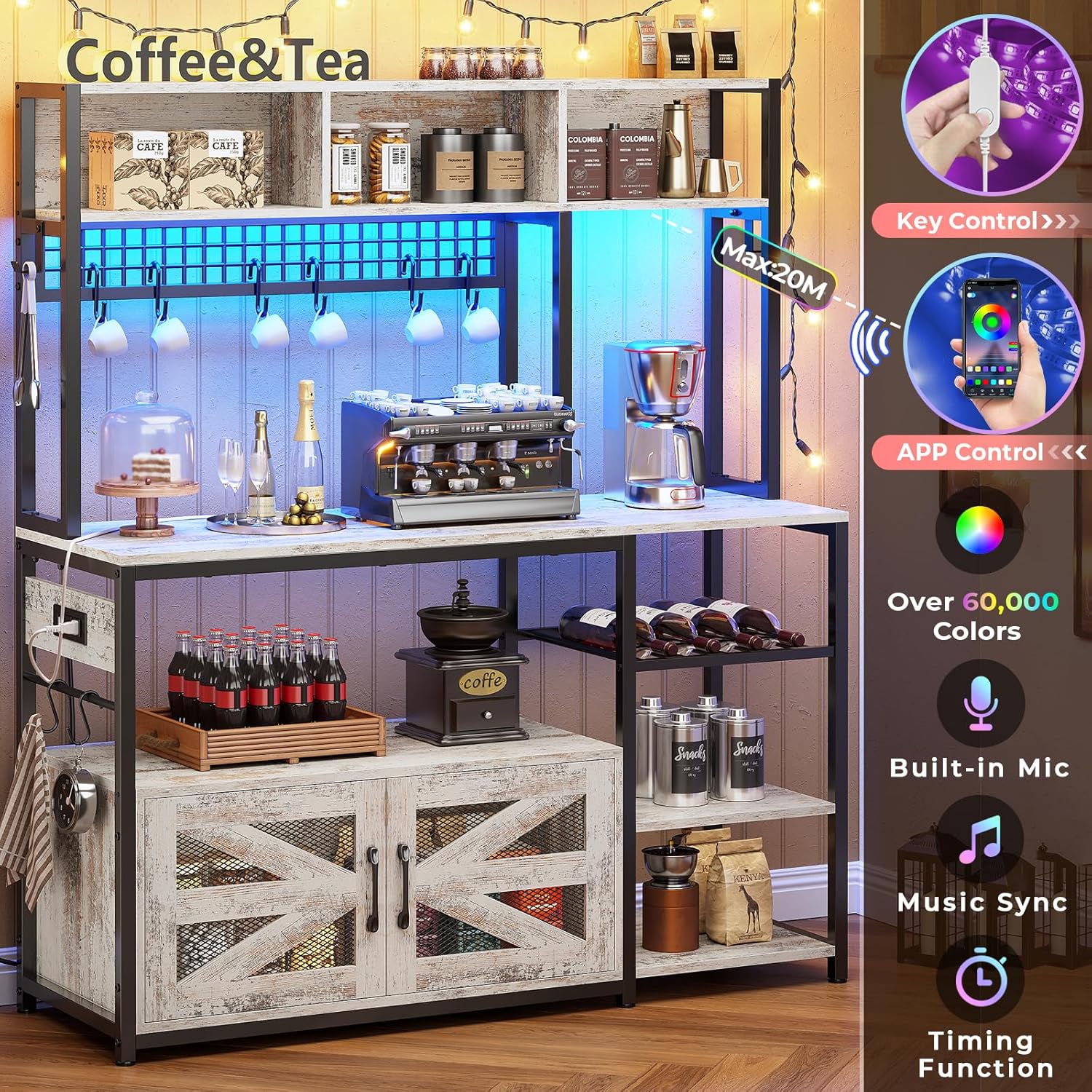 - 【Cool & Smart Led Light】The coffee bar comes with the RGB LED light strip, remote control via APP, Over 60000 colors and 29 flashing modes for your to choose. Led light strip with music sync function, built-in sensitivity adjustable mic, led light color will change with the rhythm of the sound and music.