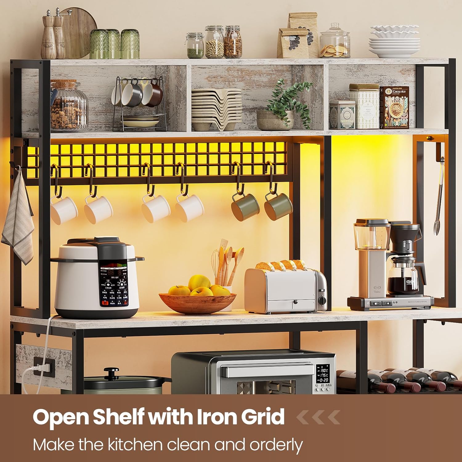 - 【Bakers Rack with Power Outlets】This bakers rack is equipped with 2 AC outlets, 2 USB charging ports to provide power for up to 4 devices simultaneously. Our baker rack comes with the RGB LED light strip which can not only increase the atmosphere of the kitchen but also brighten the work area so that you can operate at night.