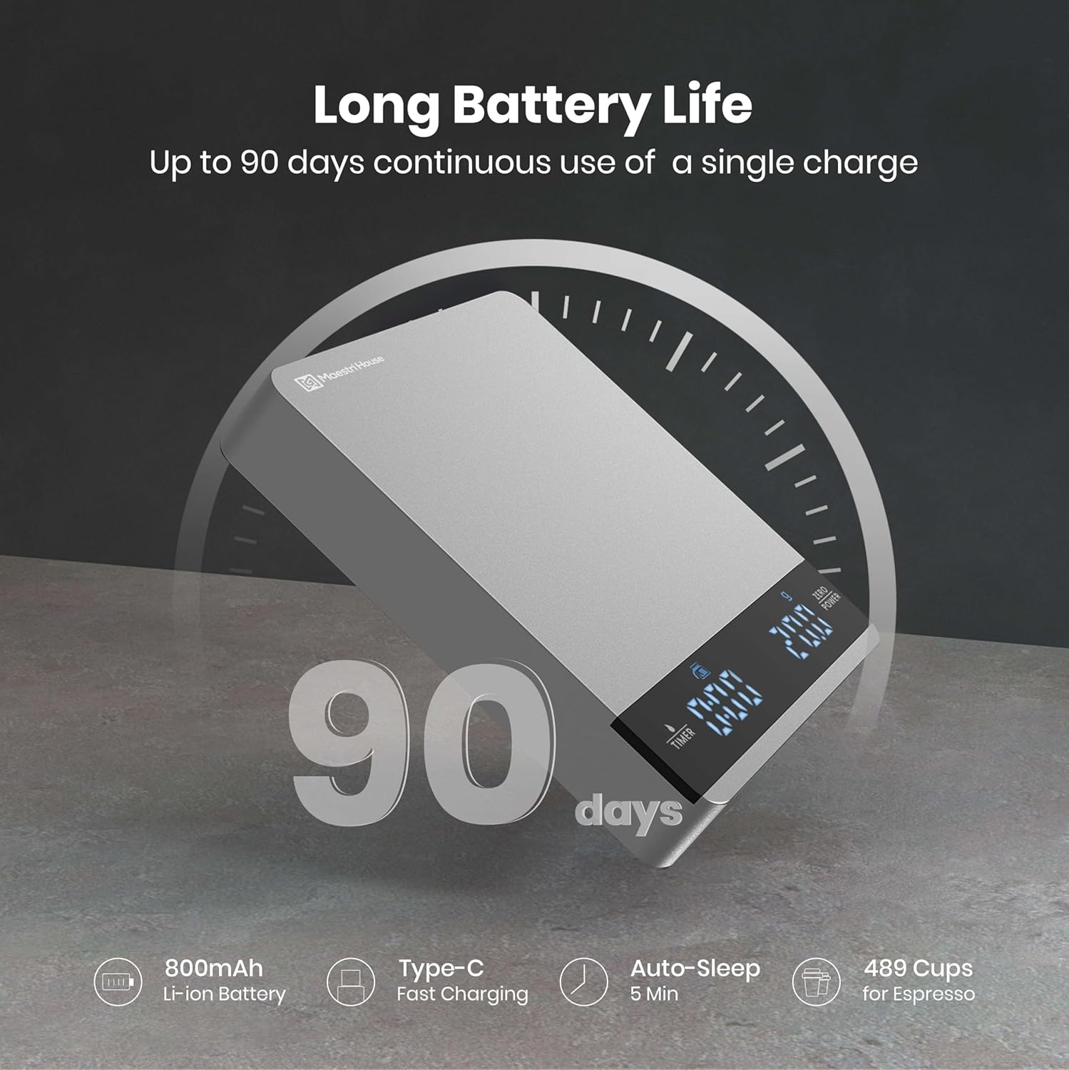 - 【Long Standby Rechargeable Battery】This digital coffee scale comes with an 800mAh lithium battery and a USB-C charging cable, eliminating the need for disposable batteries. Enjoy up to 90 days of use on a single charge. To conserve power, the scale automatically enters sleep mode after 5 minutes of inactivity, extending battery life