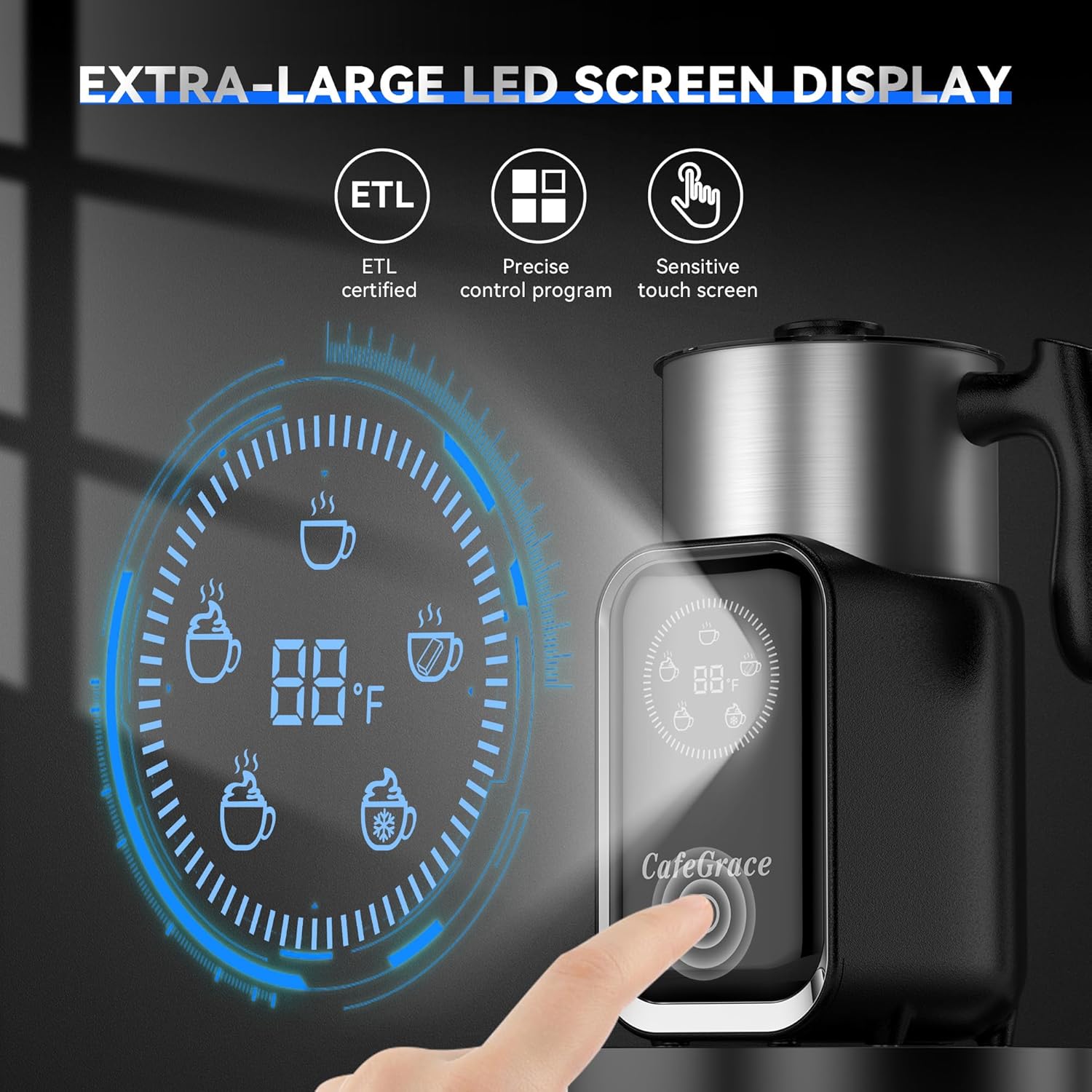 - 【EXTRA LARGE DISPLAY 】 The high-definition LCD touch display can clearly show the type of milk froth being made and the temperature change of the milk froth. The aperture on the display will blink while running, making the process of making milk froth more interesting.