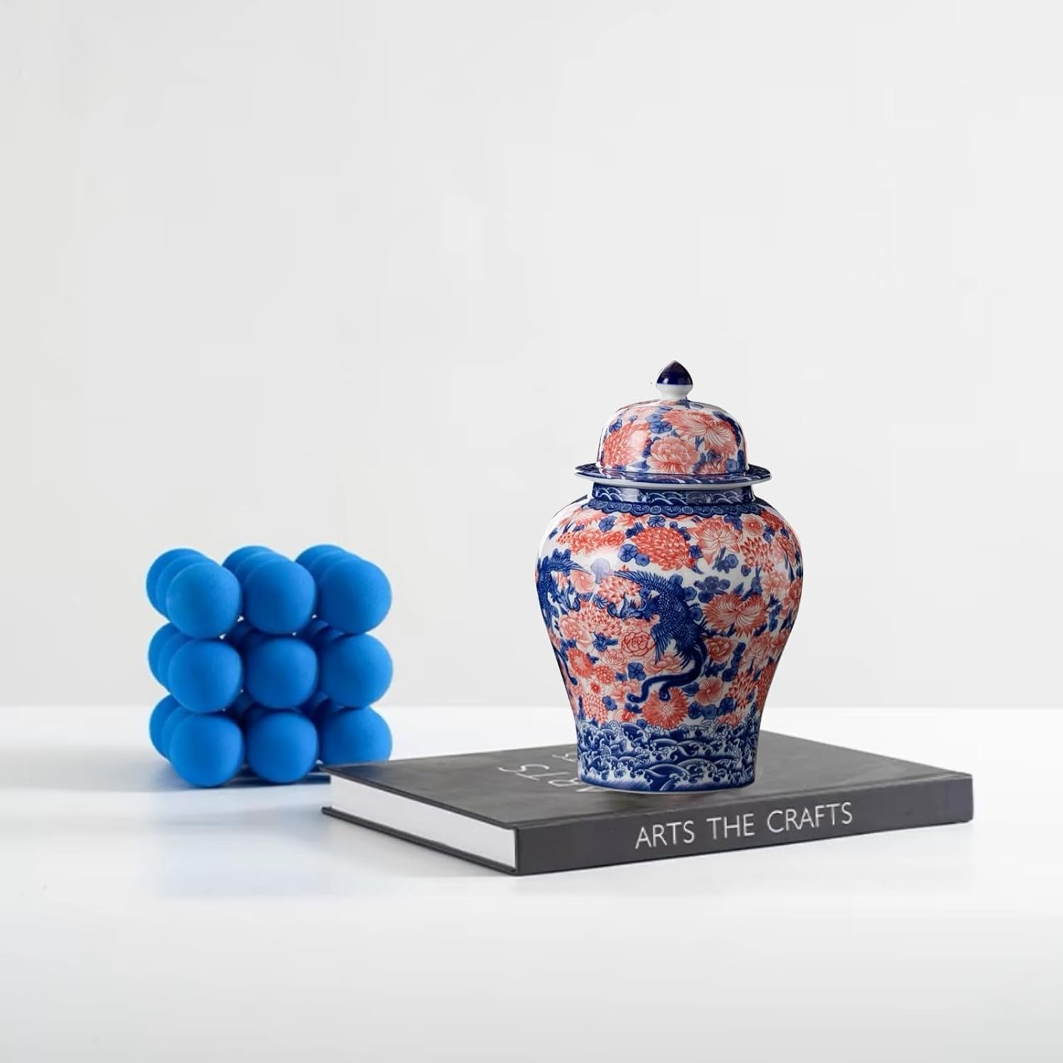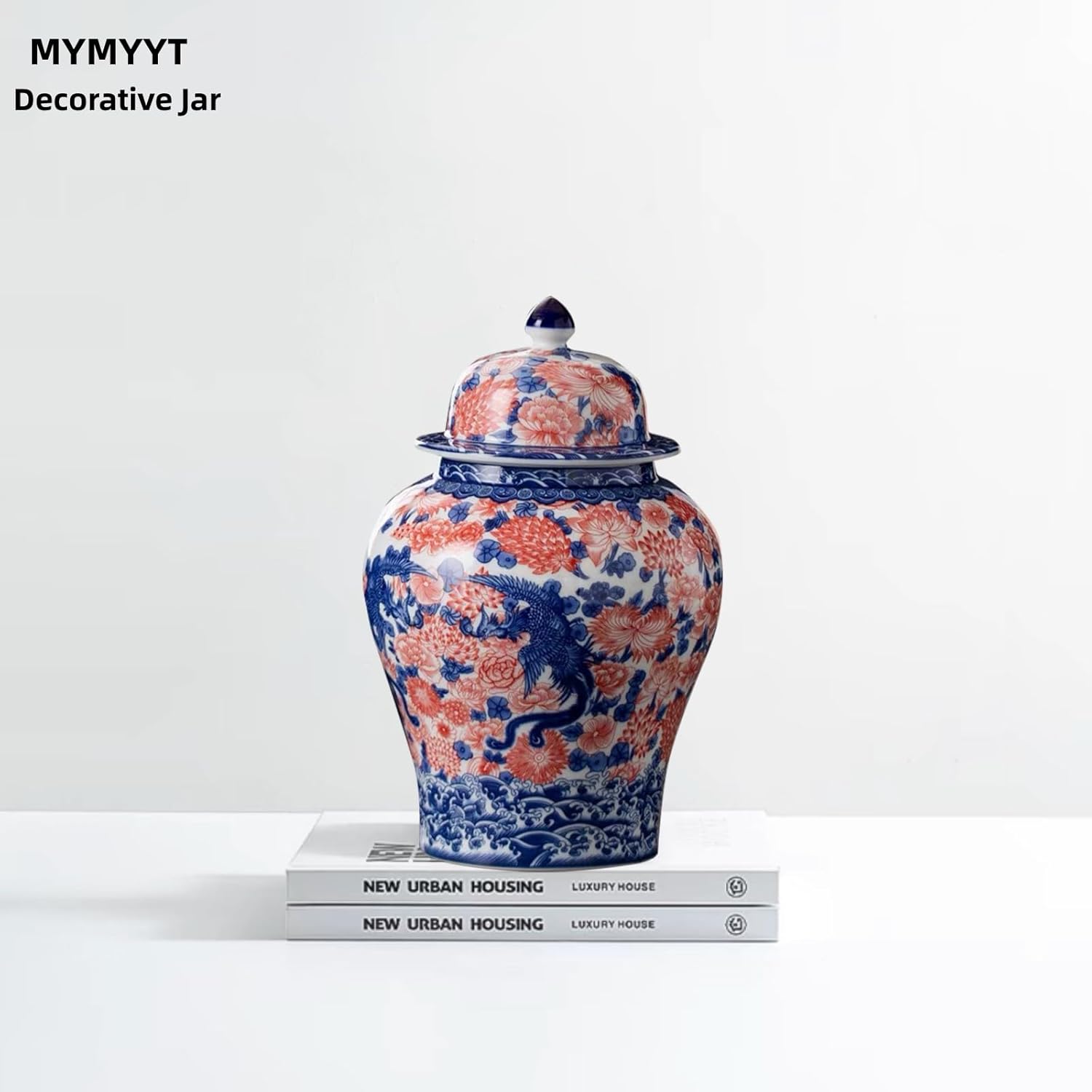 8 inches Phoenix Ginger Jar - red Ceramic Decorative with Lid flower vase, chinoiserie gift Enamel jars for Home/Kitchen/Dining/living room/shelf decor/Tea Storage