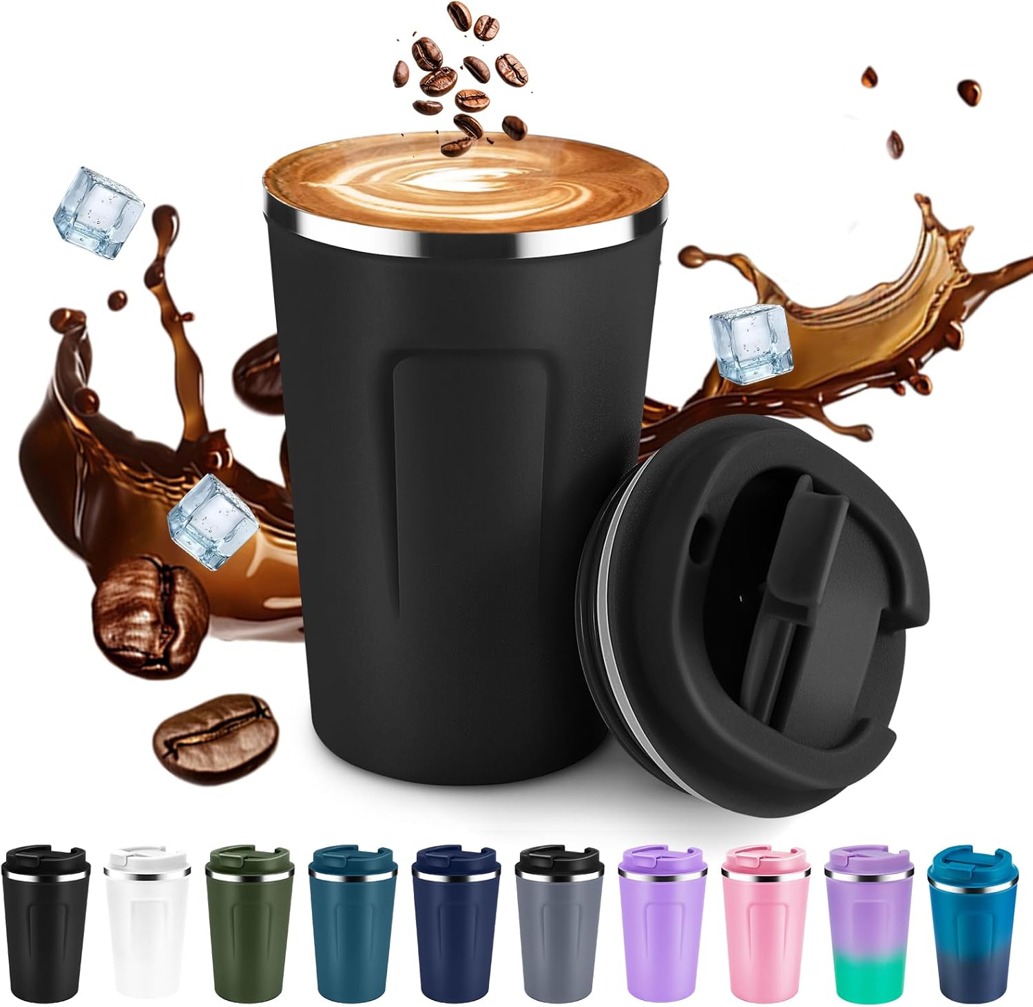 Volhoply 12 oz Double Wall Insulated Vacuum Travel Coffee Mug with Flip Lid,Reusable Stainless Steel Leak Proof Coffee Cup,Portable Iced Cafe Thermal Tumbler Suitable for Hot&Cold Drinks(Black,1 Set)