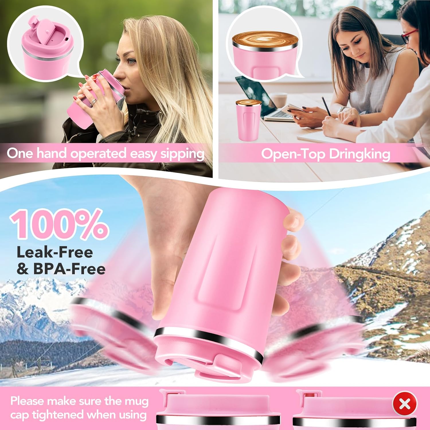 Volhoply 12 oz Double Wall Insulated Vacuum Travel Coffee Mug with Flip Lid Bulk 4 Pack,Reusable Stainless Steel Leak Proof Coffee Cups,Portable Cafe Thermal Tumbler for Hot & Cold Drinks(Pink,4 Set)
