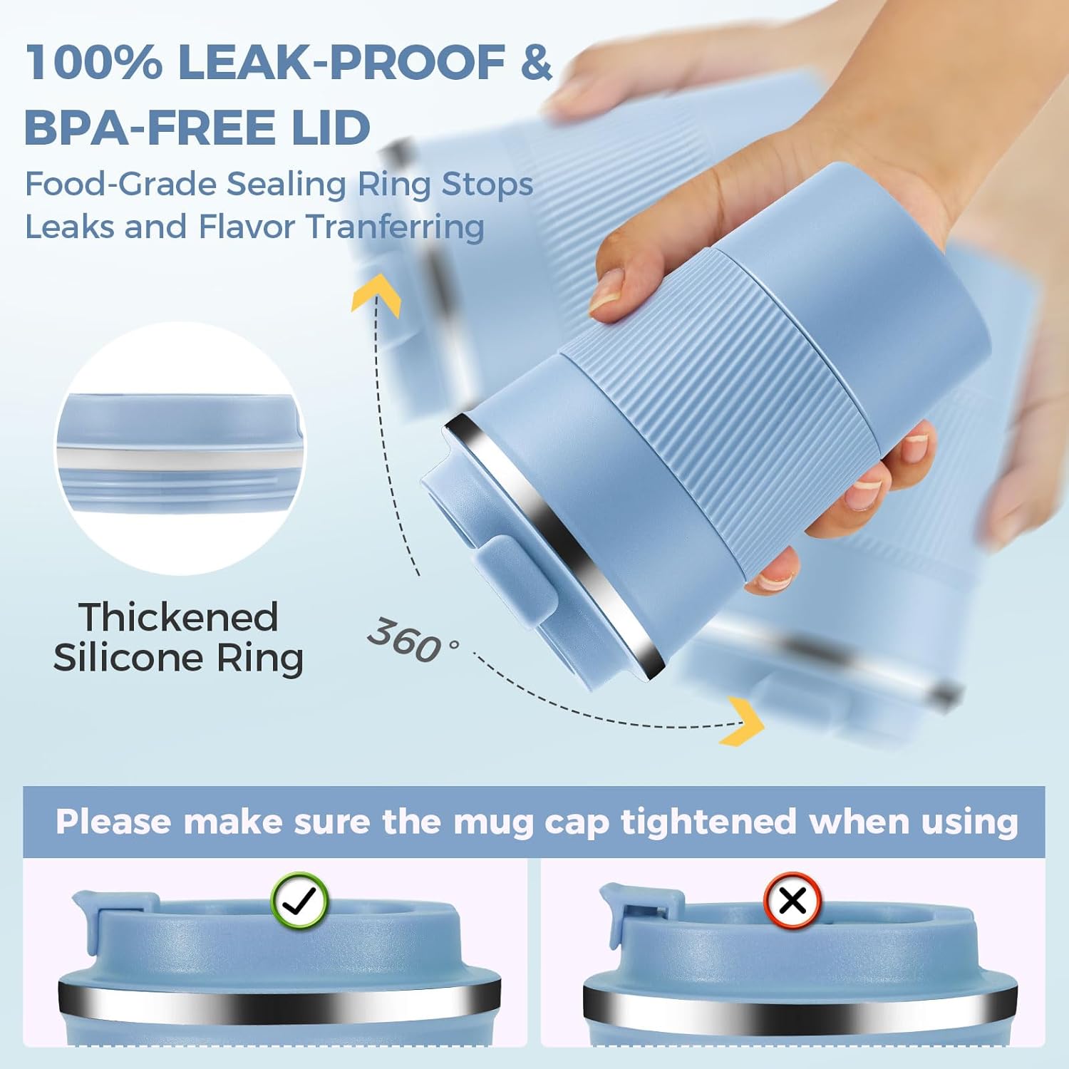 - 【18/8 Stainless Steel & BPA Free】Made of food grade 18/8 304 stainless steel,lead-free,highly insulating,and corrosion-resistant.Durable and never rusting.The cup lid and leak proof rubber ring are made of food grade rubber,free of bisphenol A,and have no odor.
