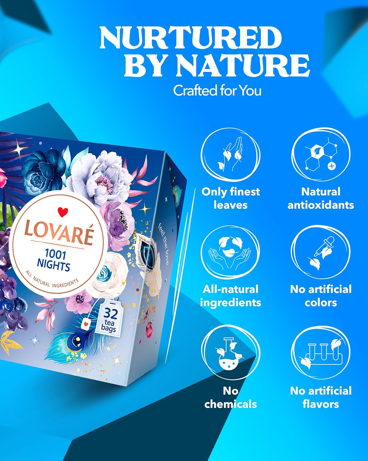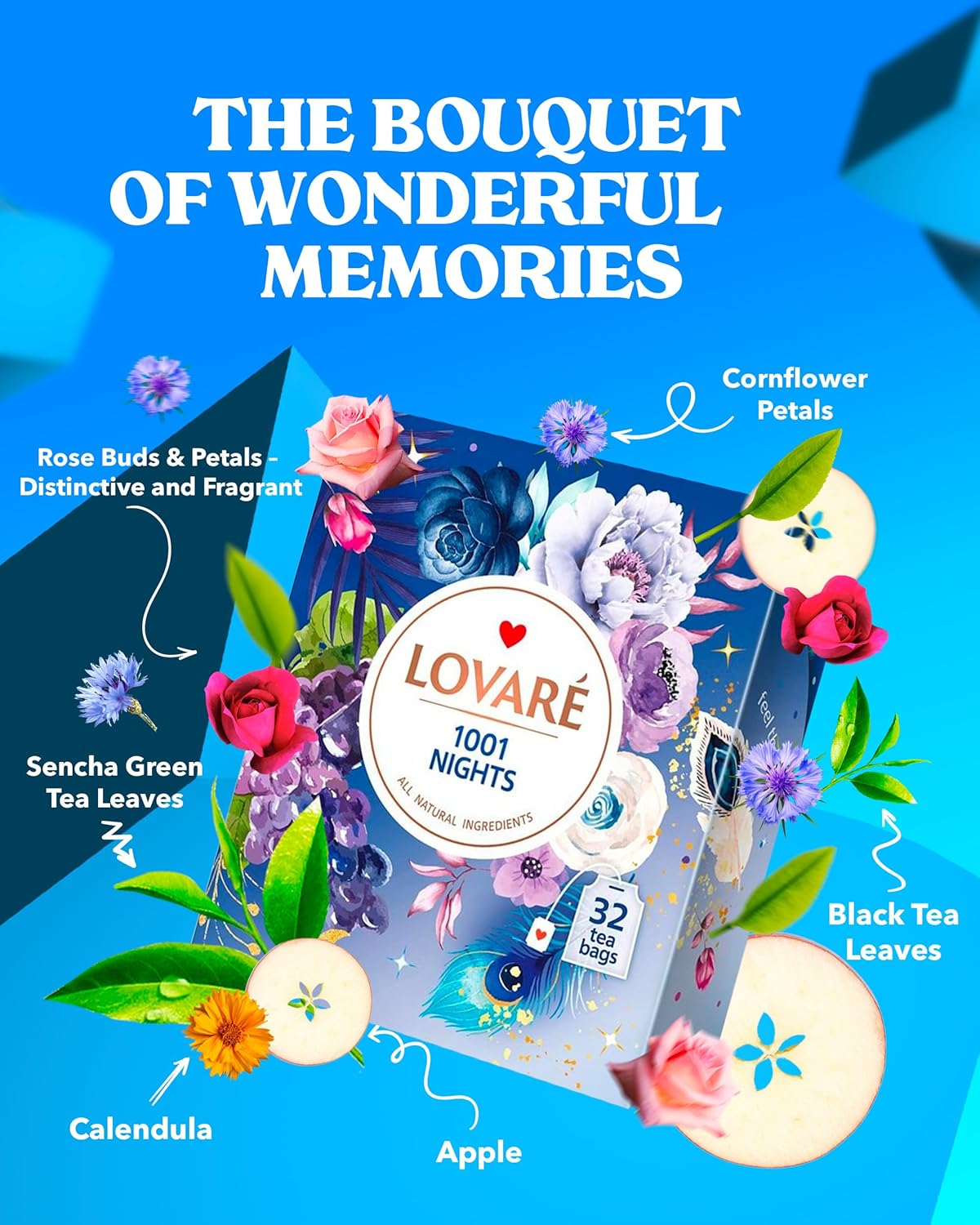 LOVARE 1001 Nights Tea Bags 64 g - Made in Ukraine - Classic Black and Sencha Green Flavored Tea Blend - Tea Bags Individually Wrapped - Gift Box Sets for Tea Lovers (32 Tea Bags x 2 g Each)