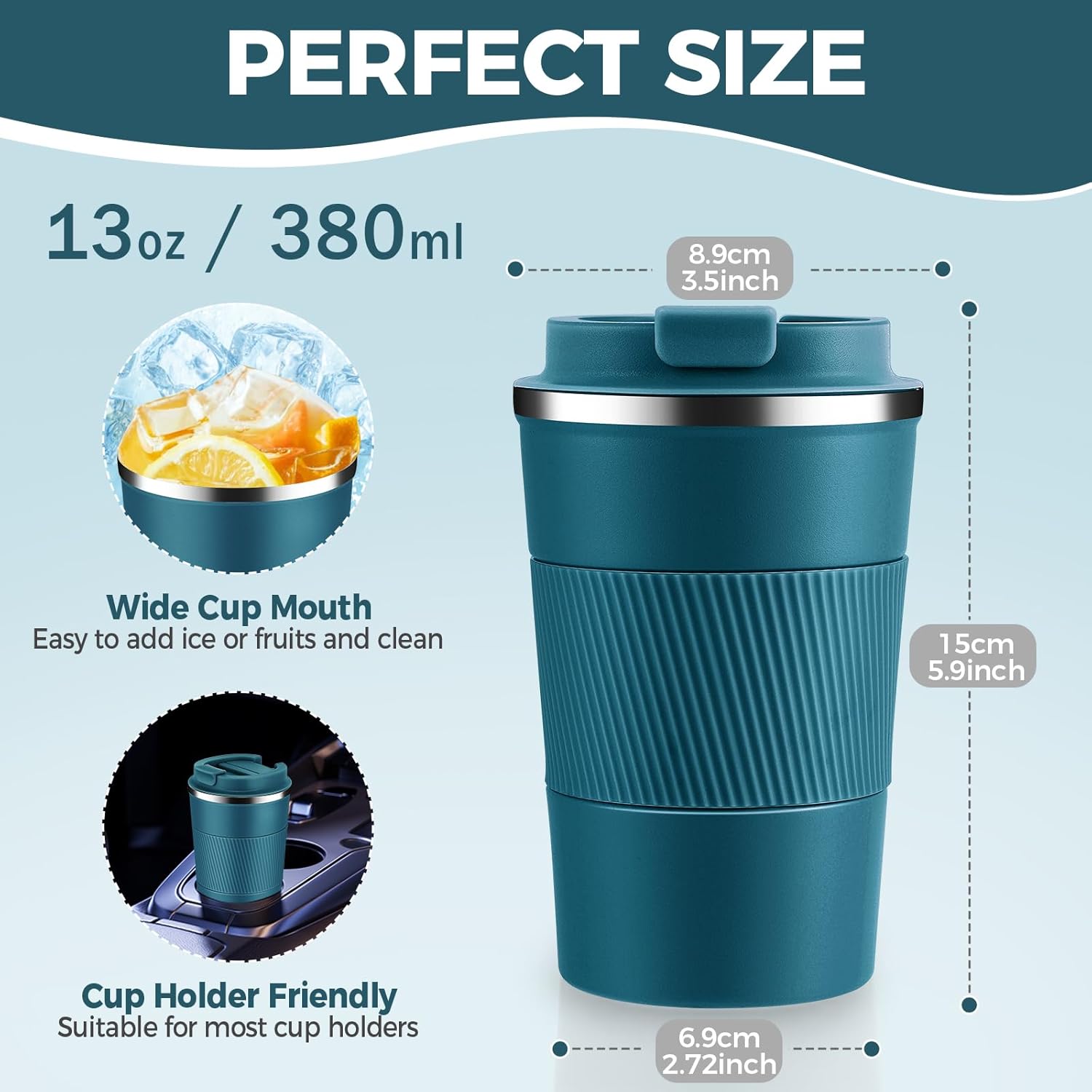 Volhoply 13 oz Stainless Steel Insulated Travel Coffee Mug with Fip Lid,Reusable Double Wall Vacuum Metal Coffee Cup,Portable to Go Leak Proof Cafe Thermal Tumbler for Hot & Cold Drinks(Bule,1)