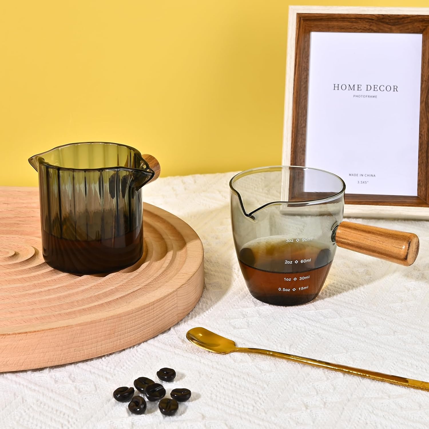 Glass Measuring Cup, 3oz Espresso Shot Glass with Wood Handle, Double Spouts Measuring Cups Pitcher Milk Cup Coffee Shot Glasses (Gray Ribbed)