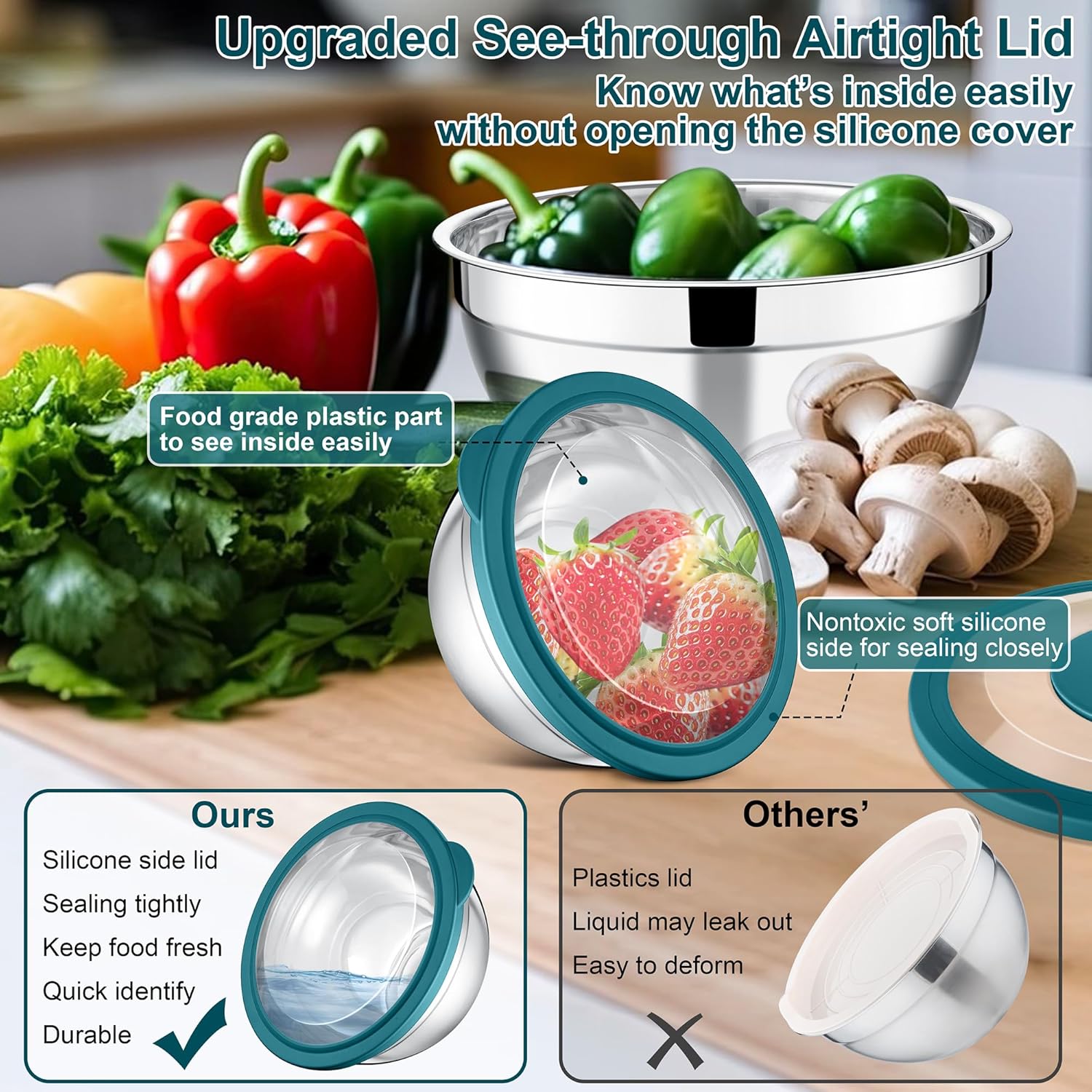 - UPGRADED AIRTIGHT CLEAR LIDS: The bowl's cover is compose of transparent plastic middle part and silicone edge, This design helps to quickly identify the food inside without opening the lid, Silicone side can seal tightly, No more worry of spilling and leaking, Make sure that less dust enters the bowl and lock the freshness, Suit for storing leftovers in the refrigerator, Take them as containers for serving food, The roll-rimmed edge and lid help to easily carry food for camping or picnics, Convenience to your daily life