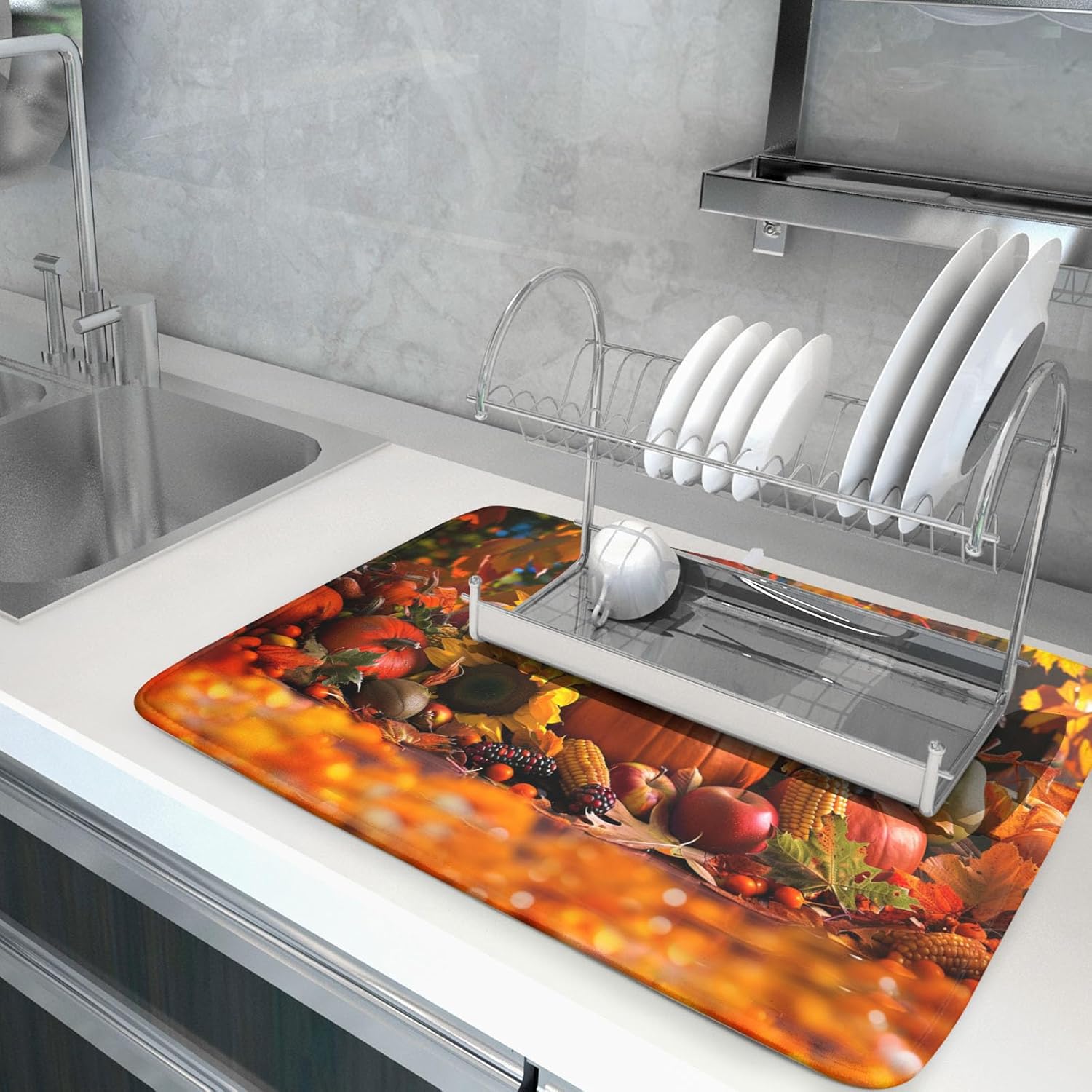 Fall Harvest Pumpkin Dish Drying Mat for Kitchen Counter,Thanksgiving Maple Leaves Sunflower Drying Mat 18 x 24 Inch with Absorbent Reversible Microfiber Dish Drying Pad for Coffee Bar