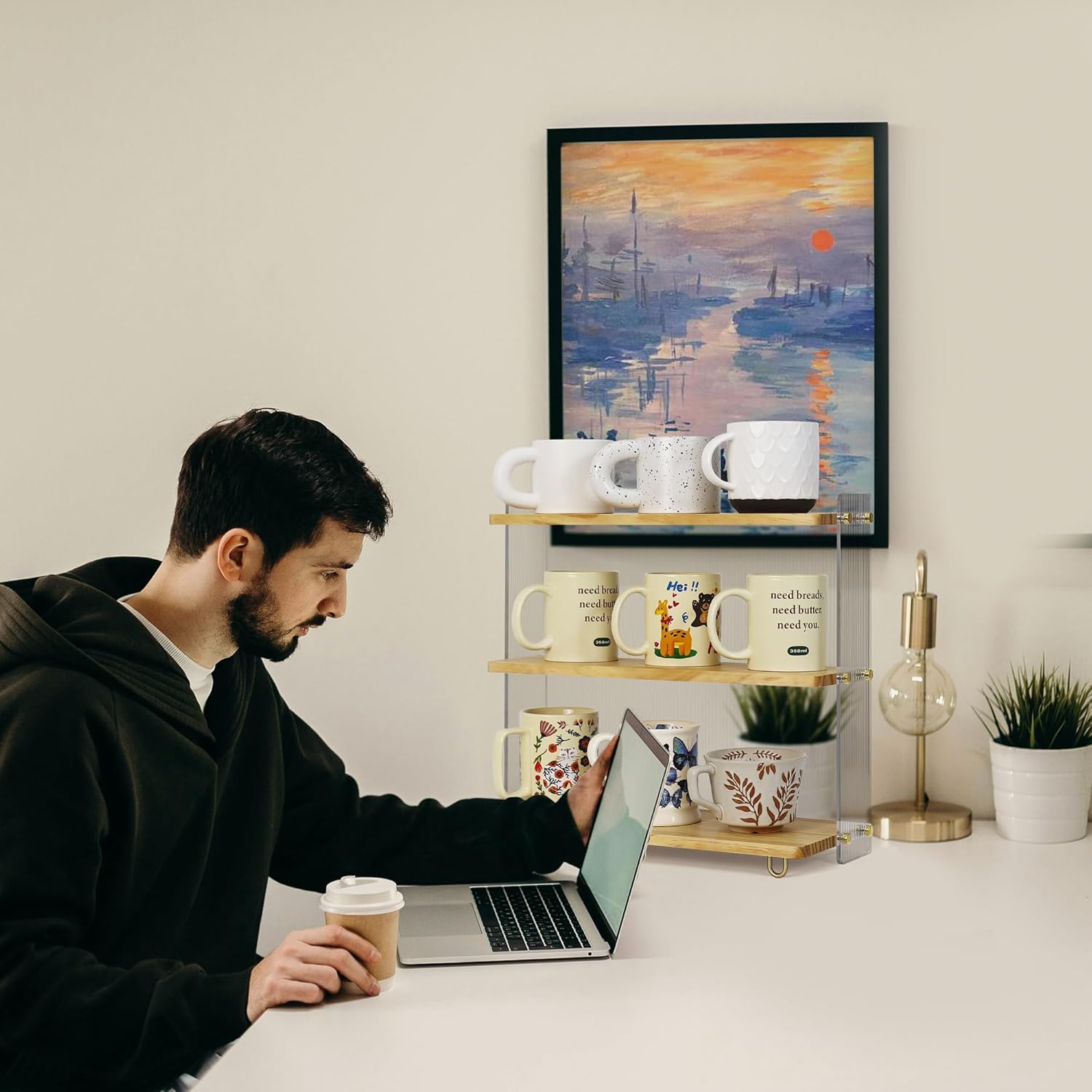 - 3-Tier Space-Saving Solution Wooden Cup Holder: 16.1*6.5*14.8 inch. The Wooden Coffee Cup Holder is designed to efficiently organize coffee cups. Optimize countertops with open shelves designed to hold mugs, coffee bar accessories, plants, or decor. Lightweight yet sturdy, it organizes clutter while displaying items with easy-access visibility.Whether it's your kitchen, office, or cafe, it will help you maintain a neat and tidy environment., with each tier spaced to ensure stability and ease of access.