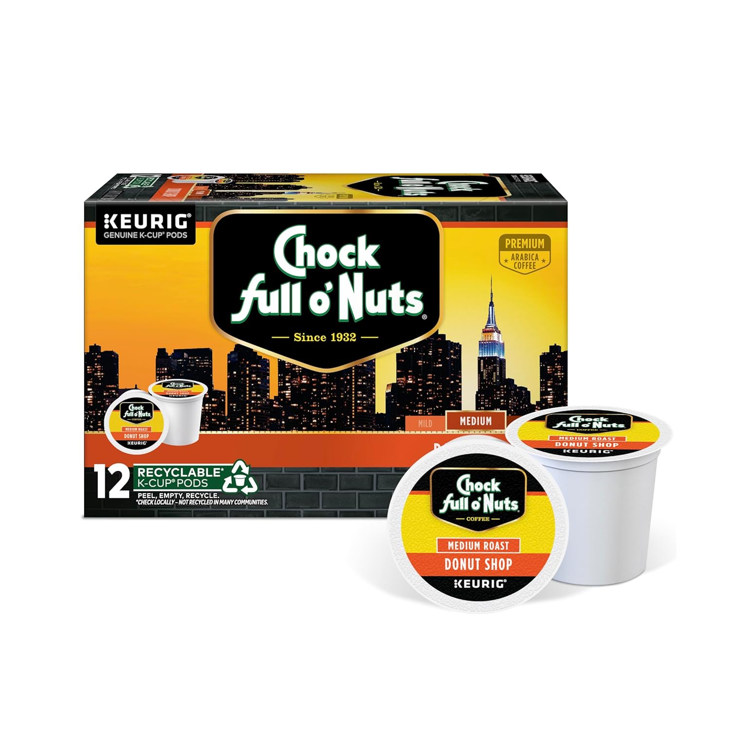 Chock full o’Nuts Donut Shop Keurig K-Cup Pods for Keurig Brewers – Premium Arabica, Medium Roast – Single Serve – 1 Pack of 12 K-Cup Pods