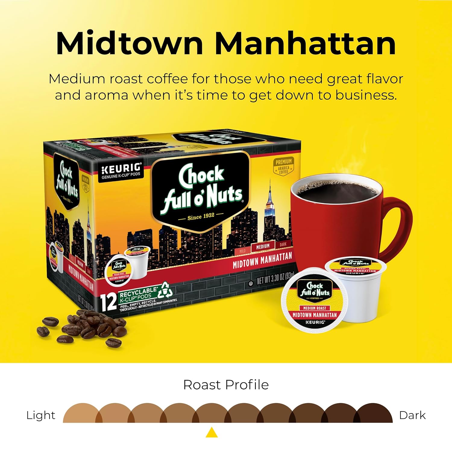 - FANTASTIC FLAVOR: Every sip of Chock full o’Nuts Midtown Manhattan Medium Roast is ideal for those who need a great aroma when it’s time to get down to business. The carefully roasted beans produce a rich, aromatic brew that’s satisfying from the first taste to the last drop, whether you need a morning boost or an afternoon pick-me-up.
