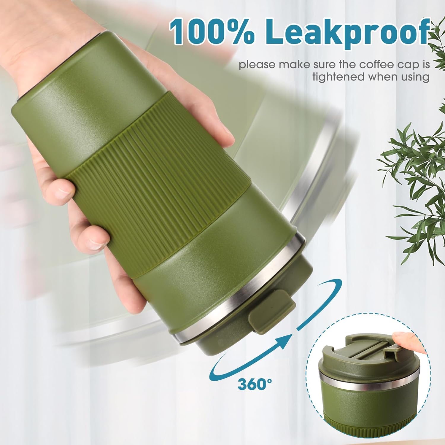- Leakproof Travel Coffee Cup: the insulated coffee mug with spiral side comes with sealing rings for effective leakproof travel, you can shake the mug as much as you like without worrying about liquid spilling over and wetting your travel or office bag, the travel coffee mug includes a clamshell opening that makes it easy to drink with one hand, whether you're walking or sitting in the car, the size of the spout ensures that you will not get spilled in an emergency