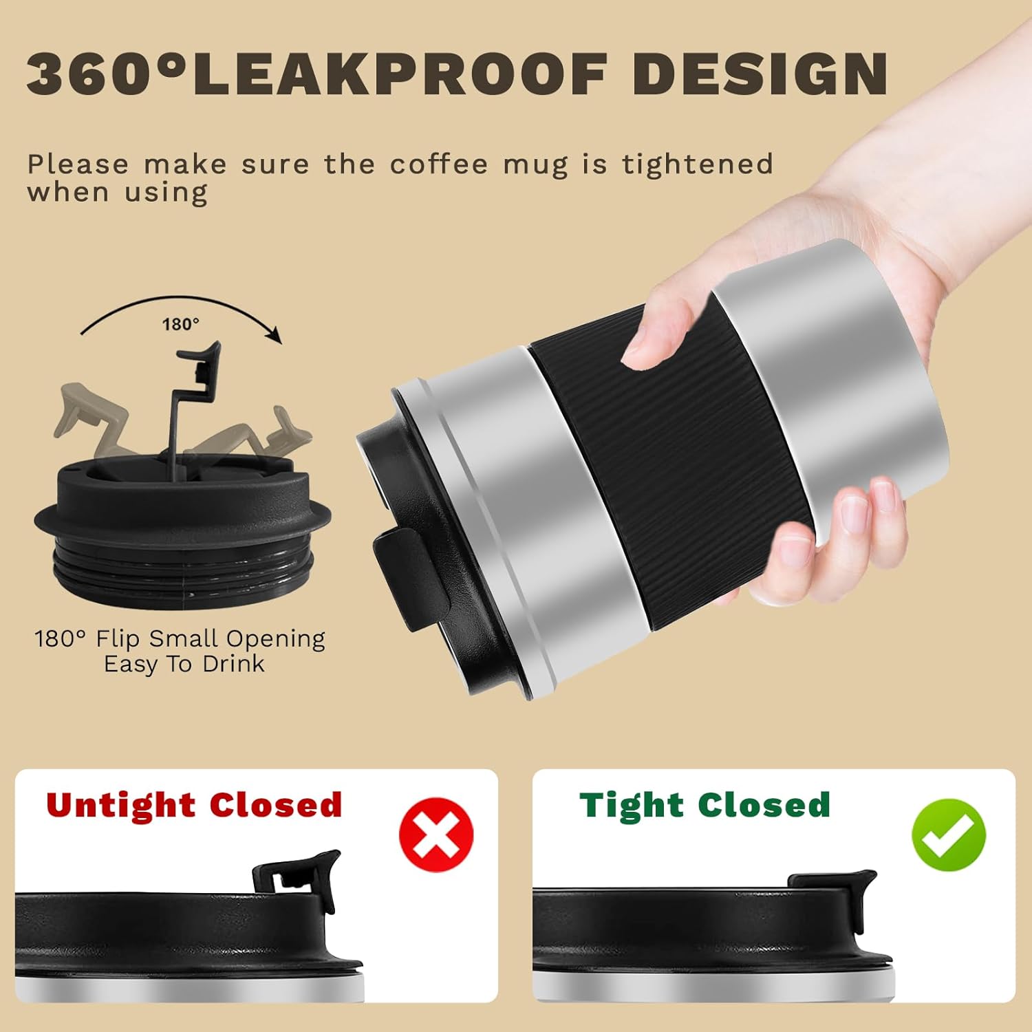 - Convenient One-Handed Drinking: This travel coffee cup features an eco-friendly flip lid that's easy to open and close. The lid has a sealed silicone ring to prevent leaks and spills, along with a drinking hole for direct sipping or using a small straw. The silicone sleeve on the body makes it easy to hold.