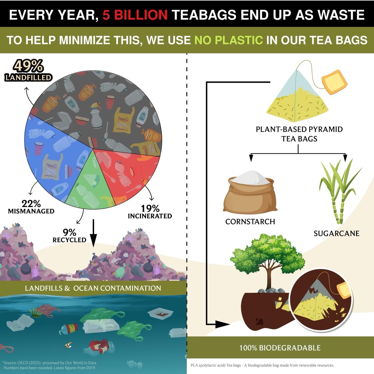 - CONVENIENTLY PACKED - The tea comes packed in pyramid bags that allow for a more fuller and intense brew as it provides ample space for the tea leaves to unfurl and infuse. We have removed individual sachets from our packaging to reduce wastage, instead the pyramid bags are packed inside a resealable pouch that can be conveniently stored or carried as a travel tea.