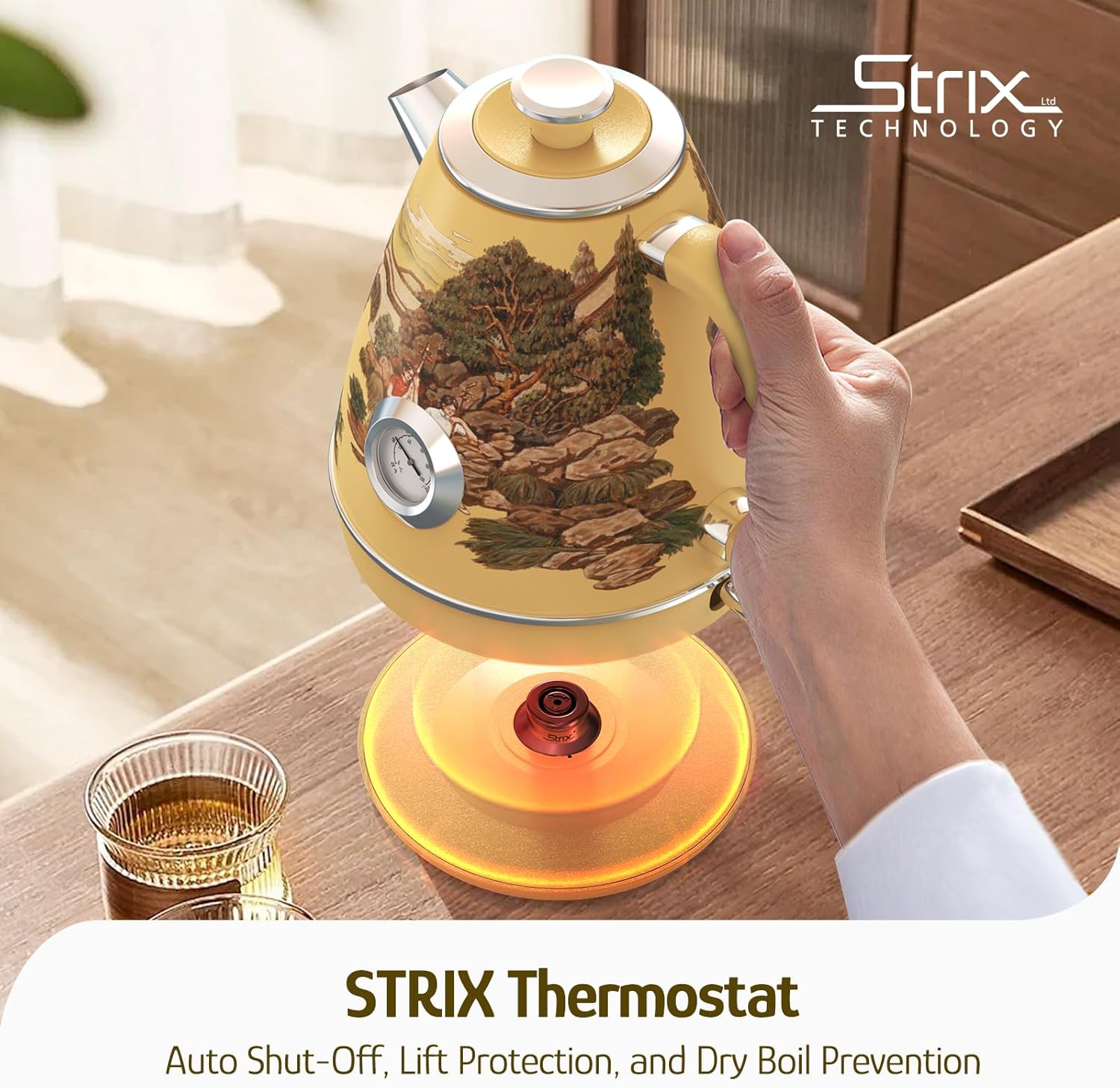 Hazel Quinn Retro Electric Kettle - 1.7 Liters / 57.5 Ounces Tea Kettle with Thermometer, All Stainless Steel, 1200 Watts Fast Boiling, BPA-free, Cordless, Automatic Shut Off - Garden Scenery